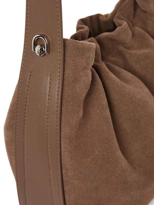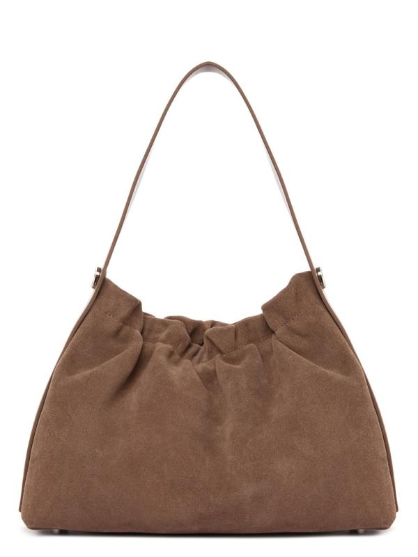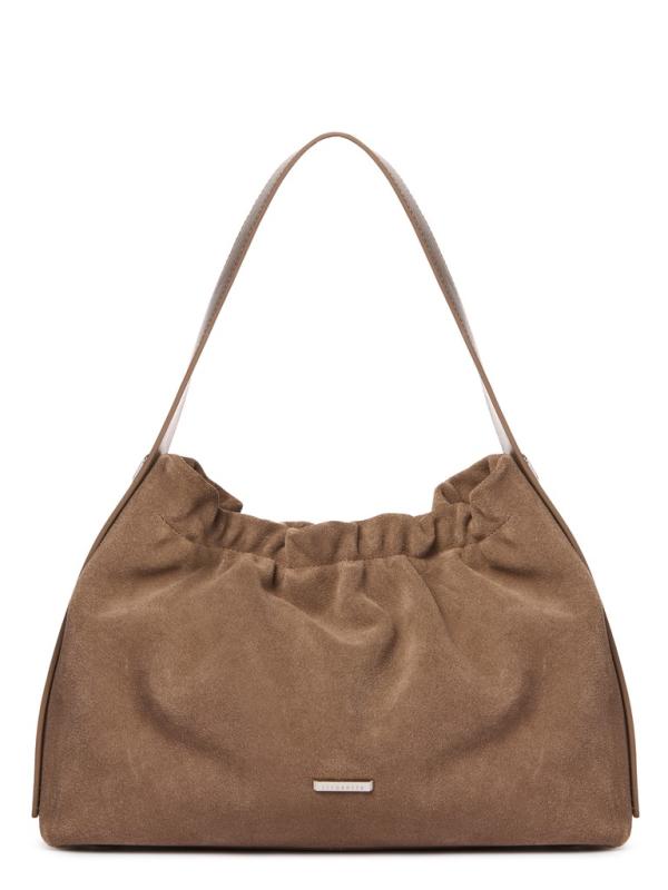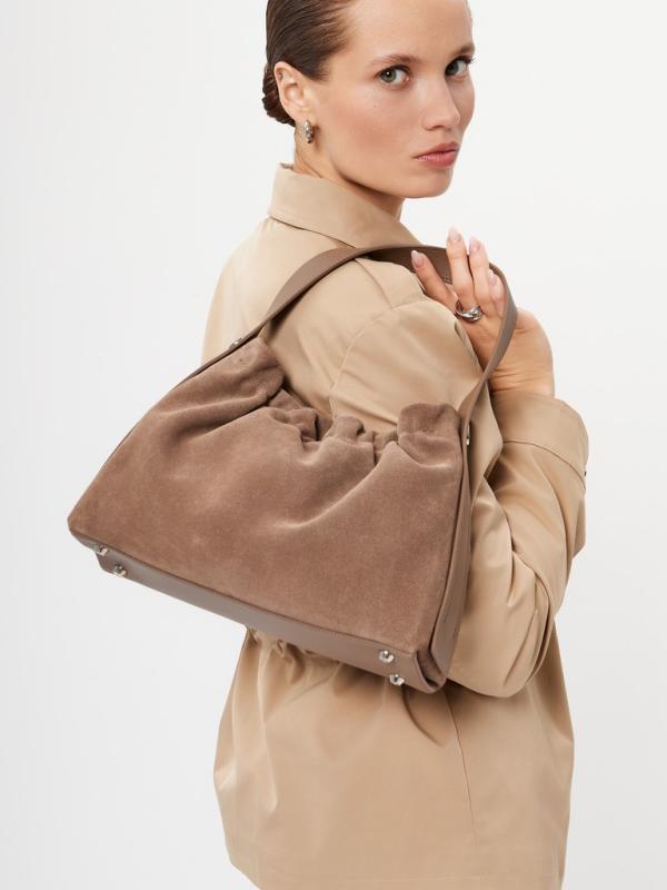 Женская сумка торговой марки Eleganzza. Эта модель — воплощение женственности в коллекции: изящный кисет из кожевенного велюра с отделкой из натуральной кожи в трендовом цвете сезона Mocha Mousse. Закрывается на скрытый магнит. Внутри одно отделение с карманом на молнии и открытым карманом. Высота ручки - 20 см. Длина регулируемого съемного плечевого ремня из натуральной кожи - 114 см, ширина - 1,5 см. Модель имеет ножки на дне. Не вмещает формат А4.
