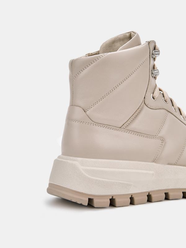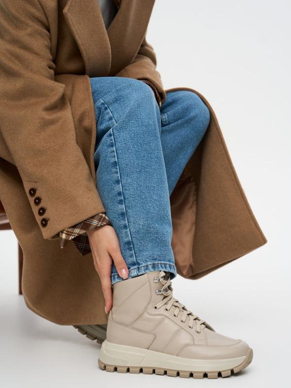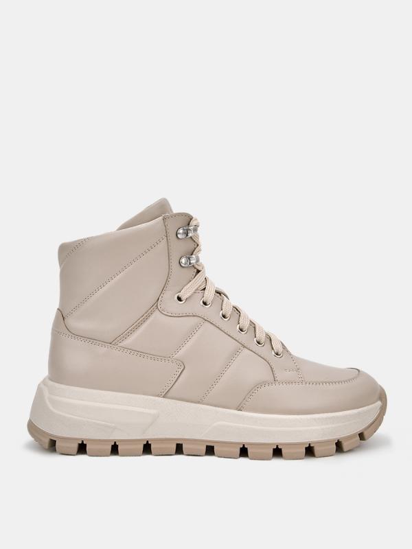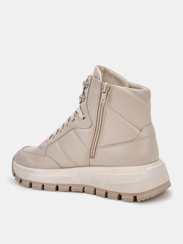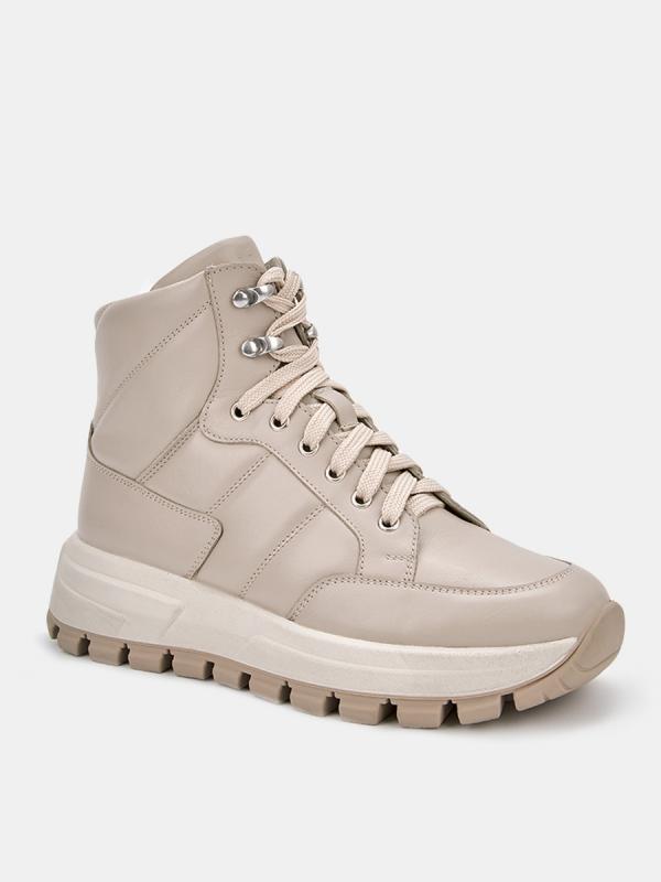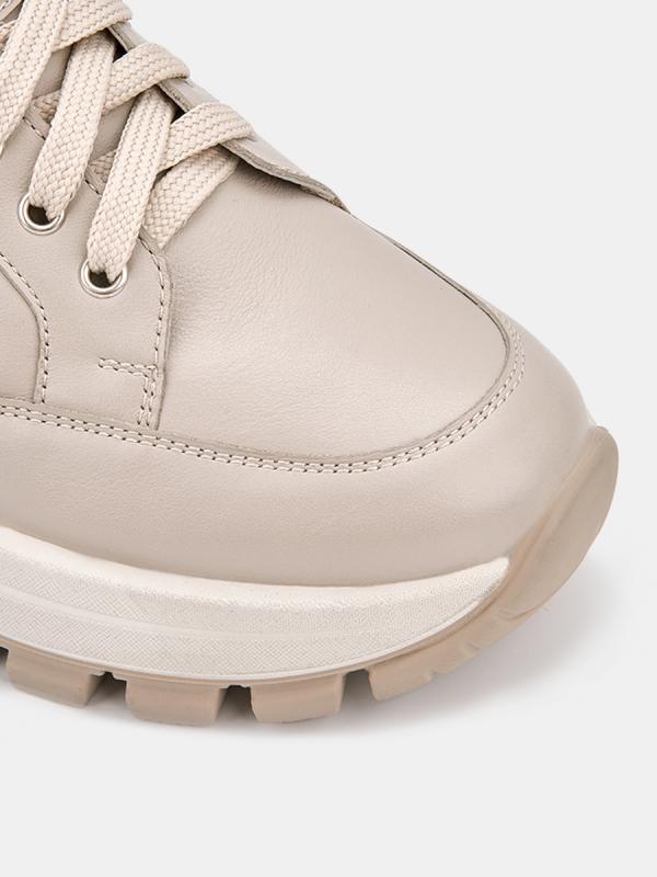 Демисезонные женские кроссовки MOON бежевого цвета на толстой подошве. Модель выполнена из качественной натуральной кожи, прочного и дышащего материала. Отстрочка на берцах в сочетании с мягкой основой создает объем. Шнуровка регулирует посадку, дополнительная пара люверсов в области щиколотки позволяет сделать прилегание максимально плотным. Мягкий верхний край защищает от попадания холодного воздуха и отлично фиксирует ногу. Двухслойные стельки созданы специально для активной жизни: верхний слой из полиэстера дышит и отводит влагу, основа из антибактериального материала Polisport смягчает удары при ходьбе, чтобы ваши ноги не уставали. Подкладка из текстиля и кожи позволяет ногам дышать. Подошва из двух видов полиуретана хорошо амортизирует и устойчива к износу, протектор обеспечивает надежное сцепление с любой поверхностью. Бежевые кроссовки дополнят повседневные образы с джинсами, брюками и спортивными костюмами.