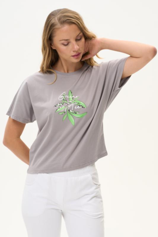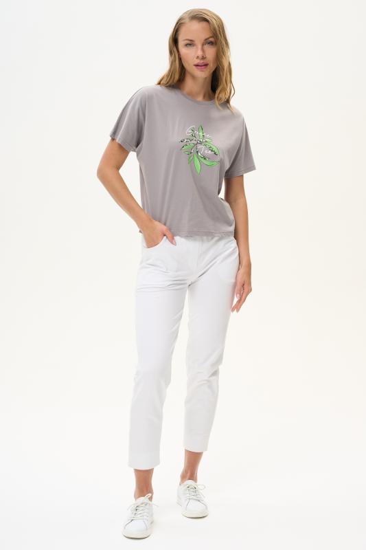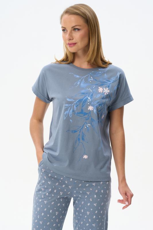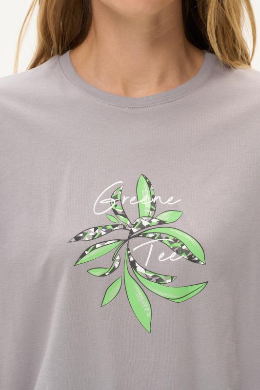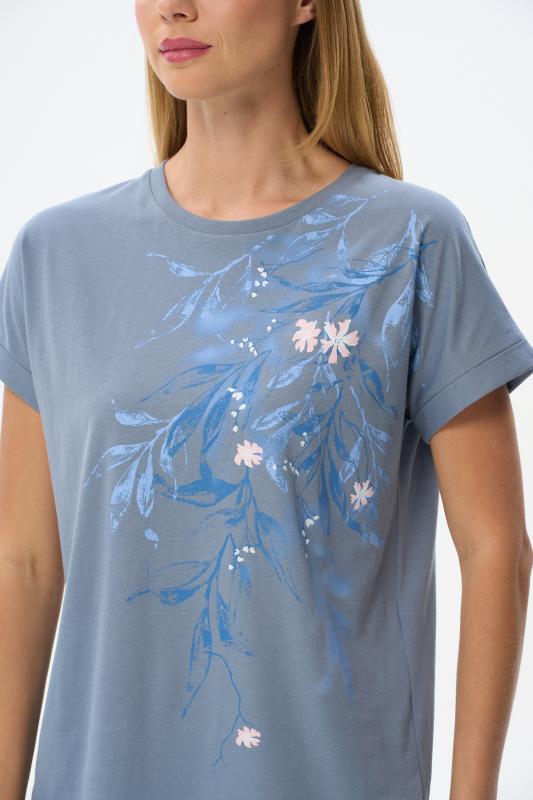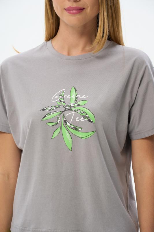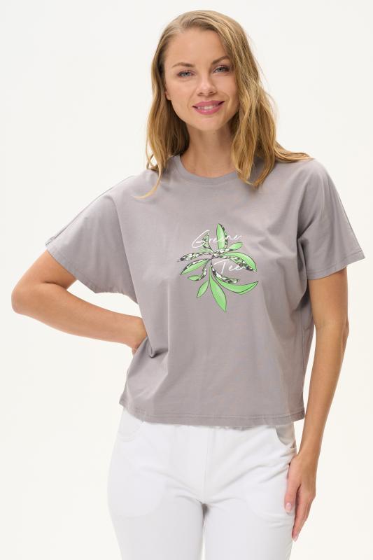 Футболка с принтом выполнена из хлопкового полотна качества пенье. Округлая горловина окантована хлопковым полотном рибана. Короткий рукав. Рост модели на фото 170