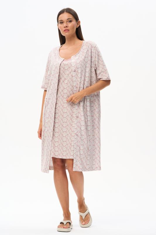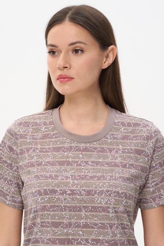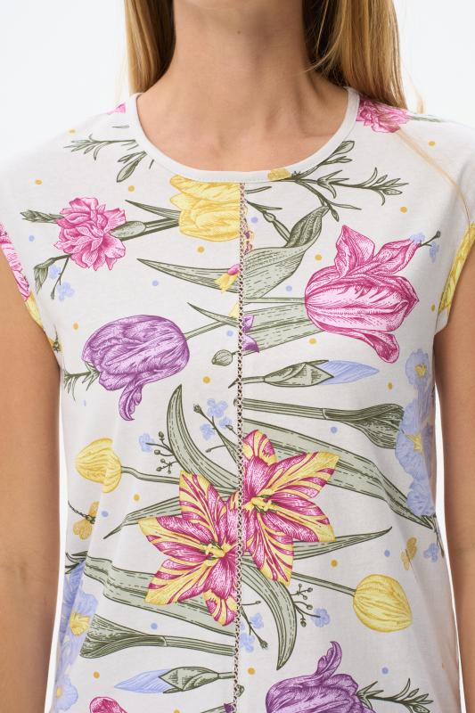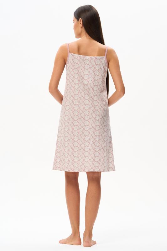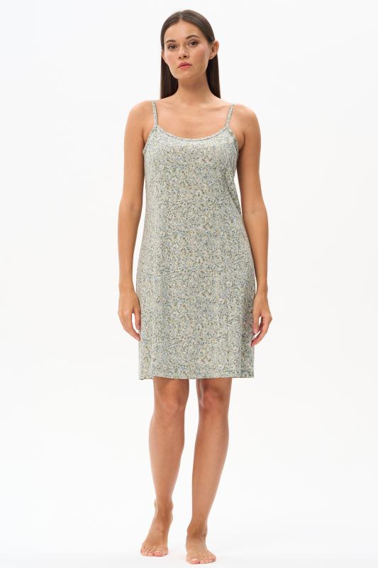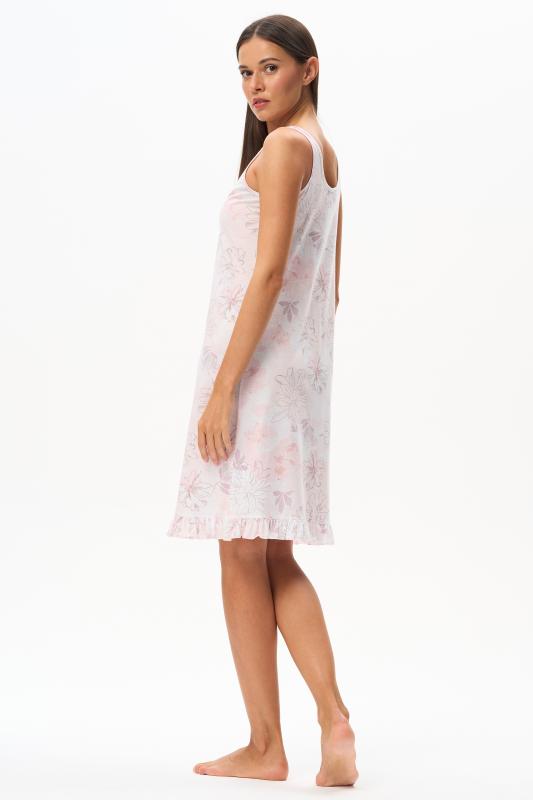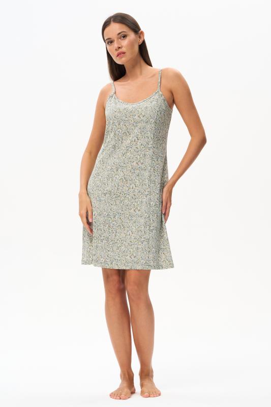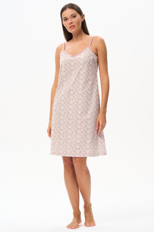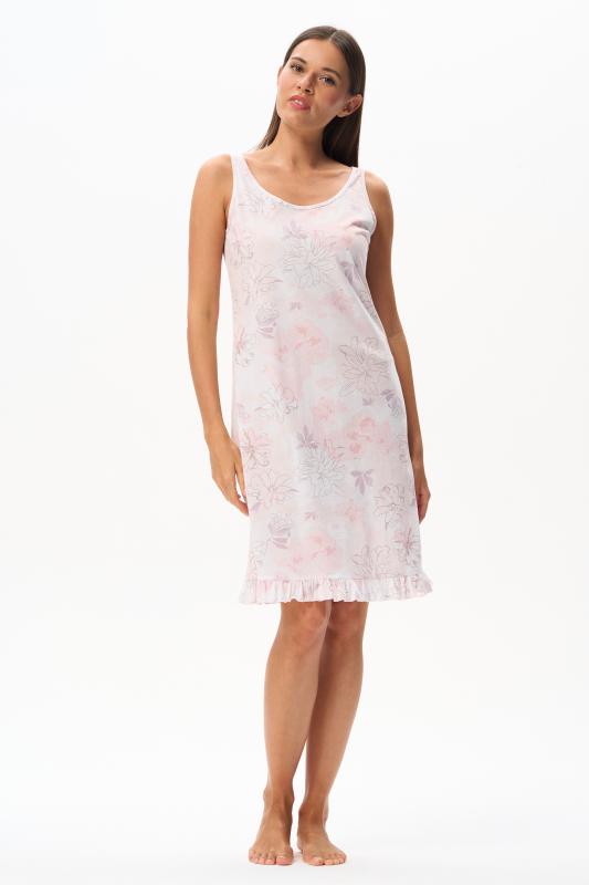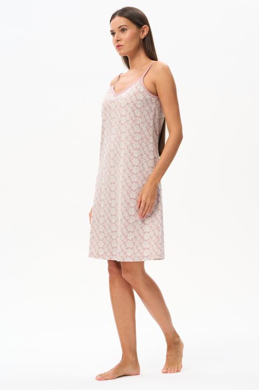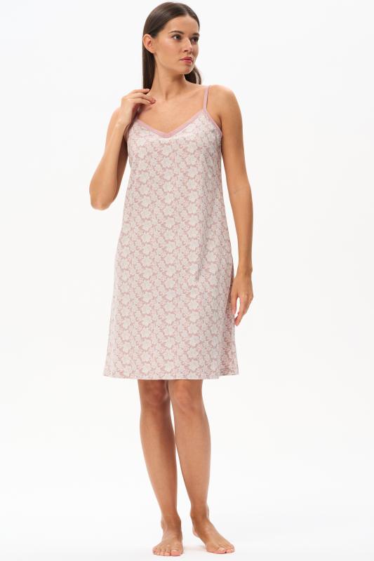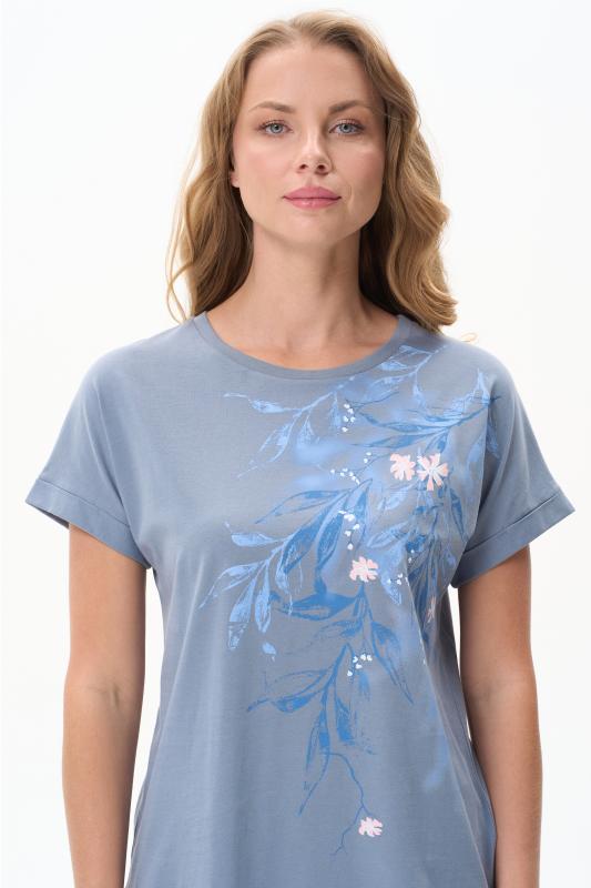 Сорочка с принтом прямого силуэта из хлопкового трикотажного полотна. Округлый вырез горловины, цельнокроеные короткие рукава. Длина изделия ниже колена. Рост модели на фото 170.