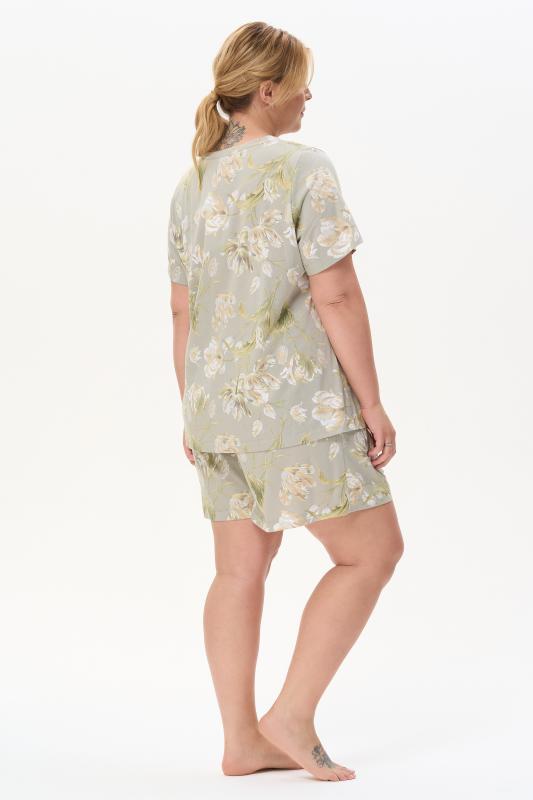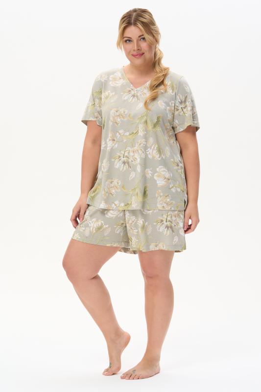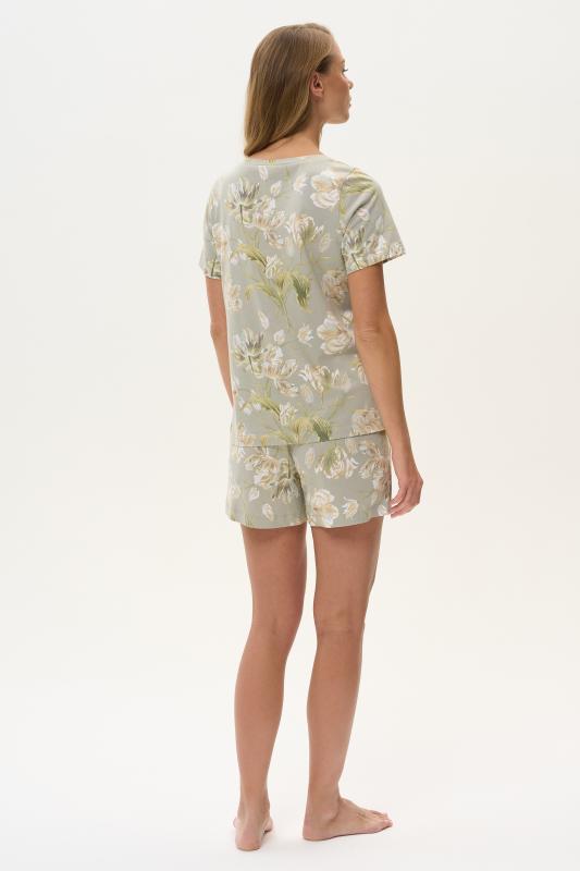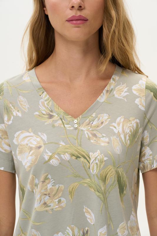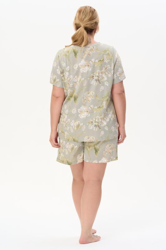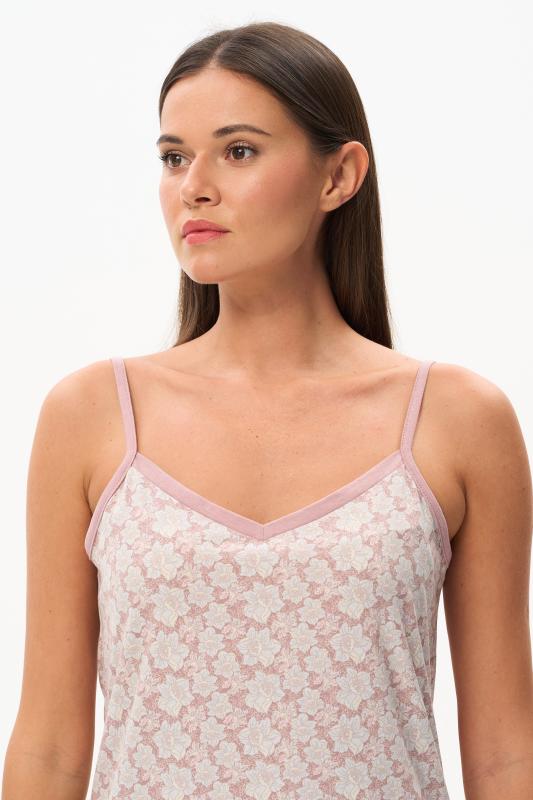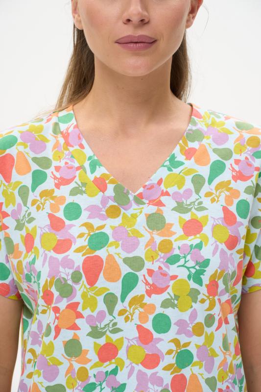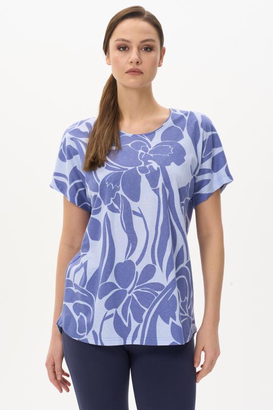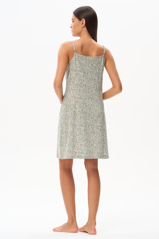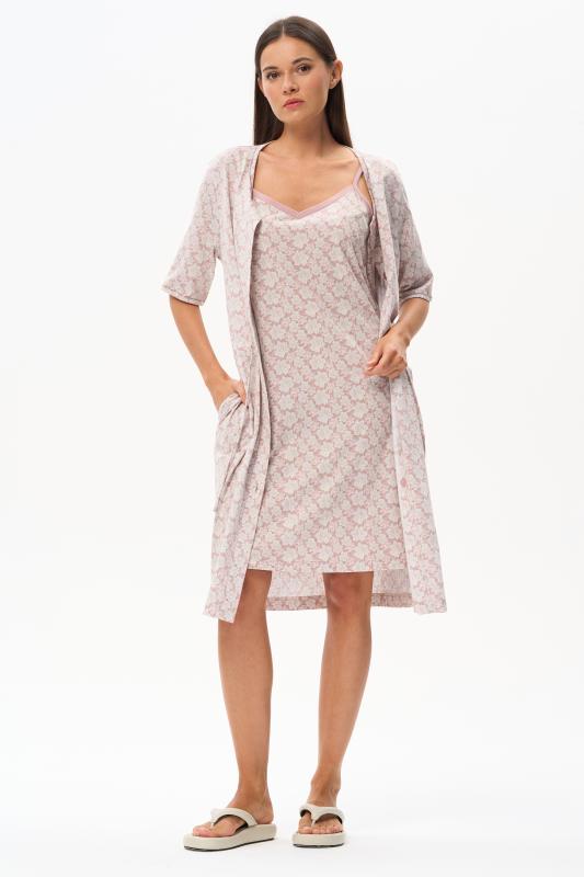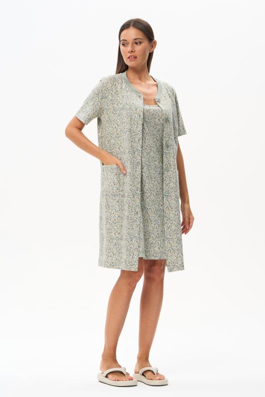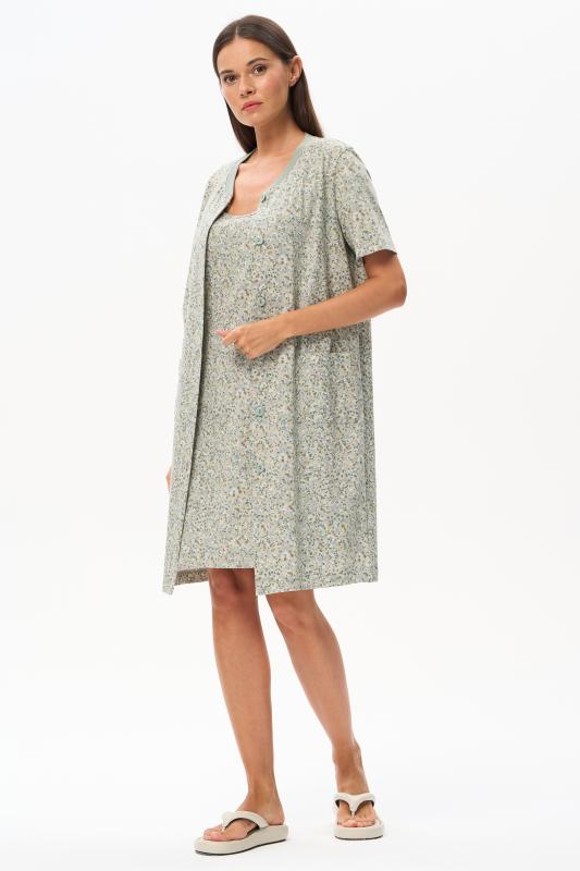 Сорочка с принтом прямого силуэта из хлопкового трикотажного полотна. Округлый вырез горловины, цельнокроеные короткие рукава. Длина изделия ниже колена. Рост модели на фото 170.