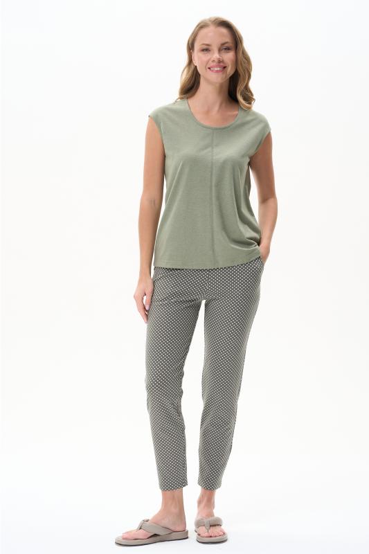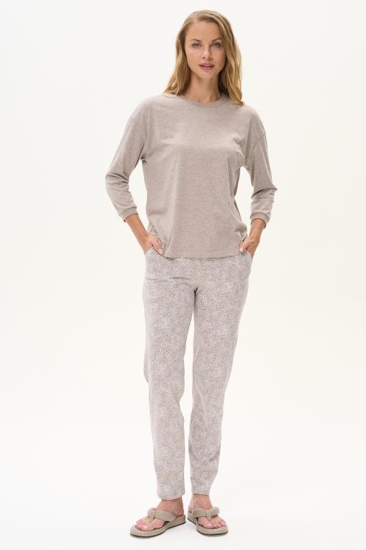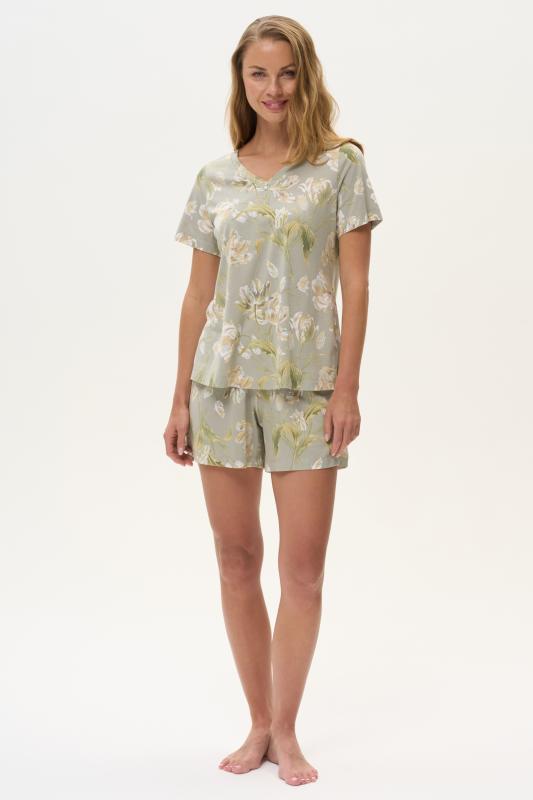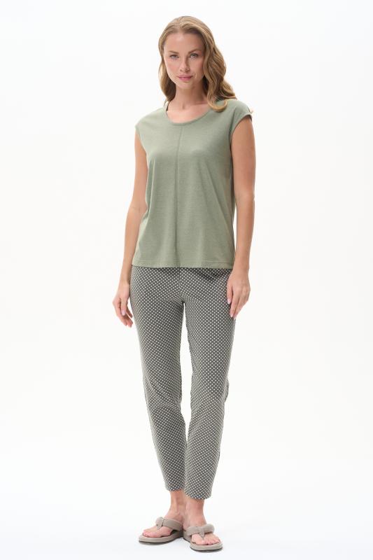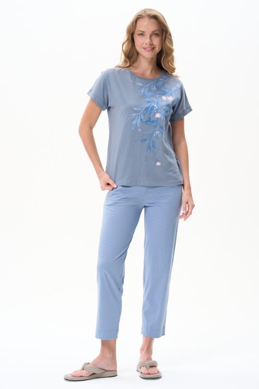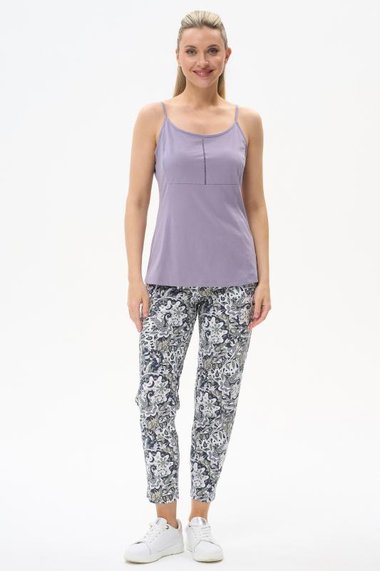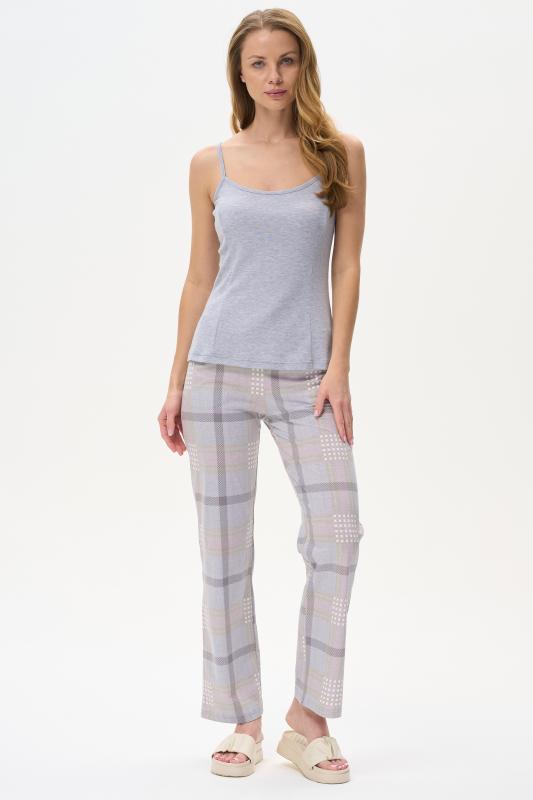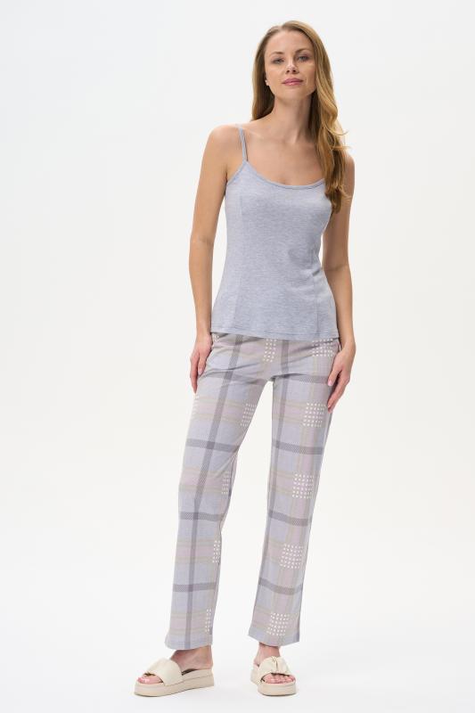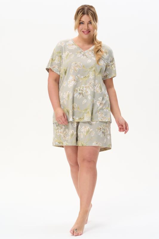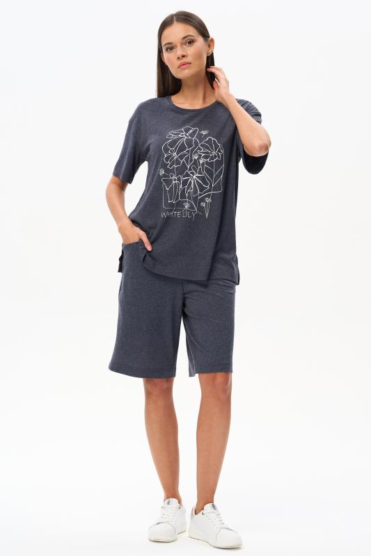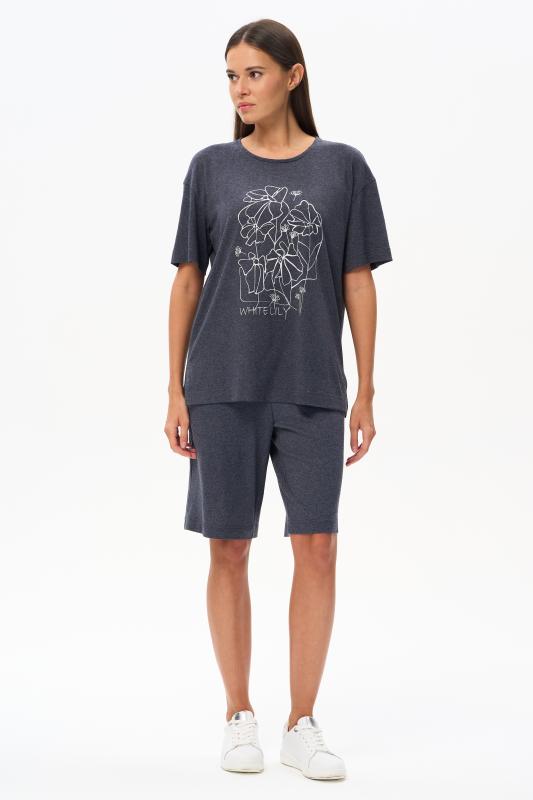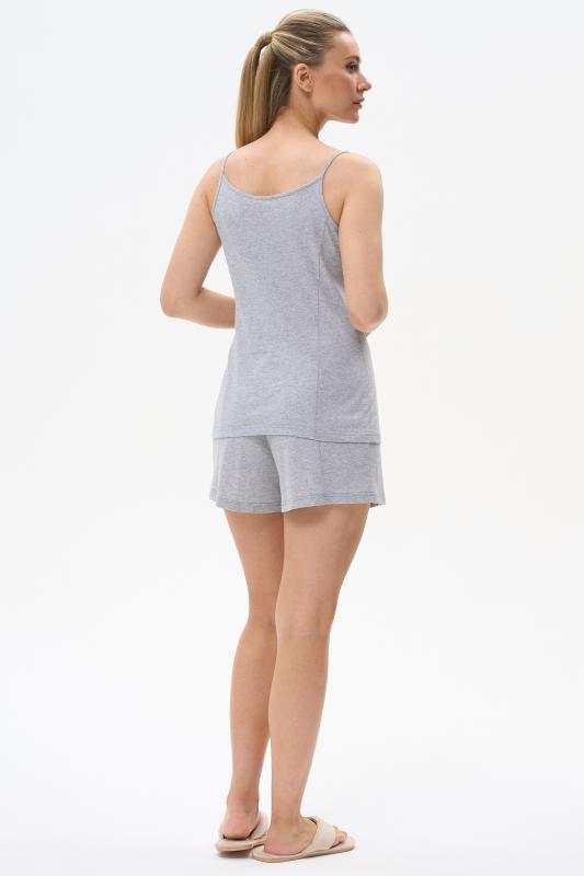 Пижама выполнена из хлопкового меланжевого полотна. Майка с круглым вырезом горловины. Спереди подрез и средний шов декорирован мережкой. Шорты без карманов, пояс с эластичной лентой внутри. Рельефные швы шорт декорированы мережкой. Рост модели на фото 175см.