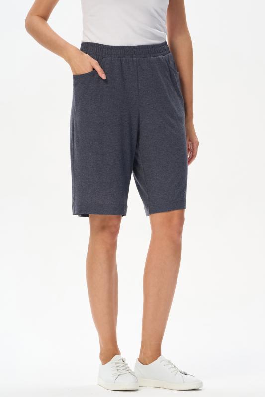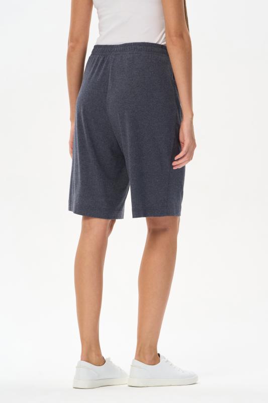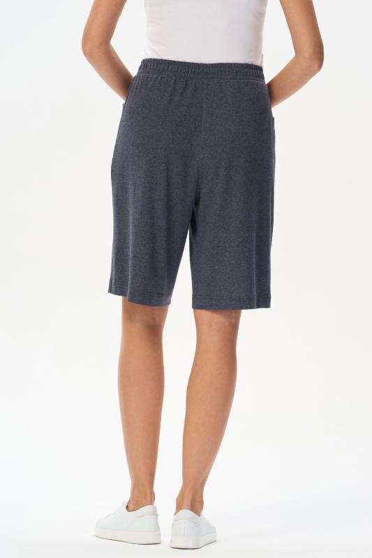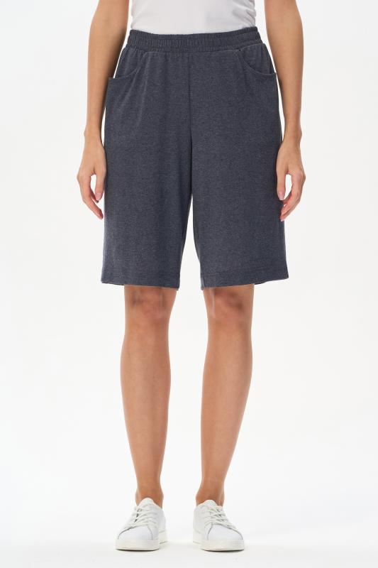 Шорты с карманами из хлопкового меланжевого трикотажного полотна. По рельефам передних половинок отделочная строчка. Цельнокроенный пояс с эластичной лентой внутри. Рост модели на фото 170