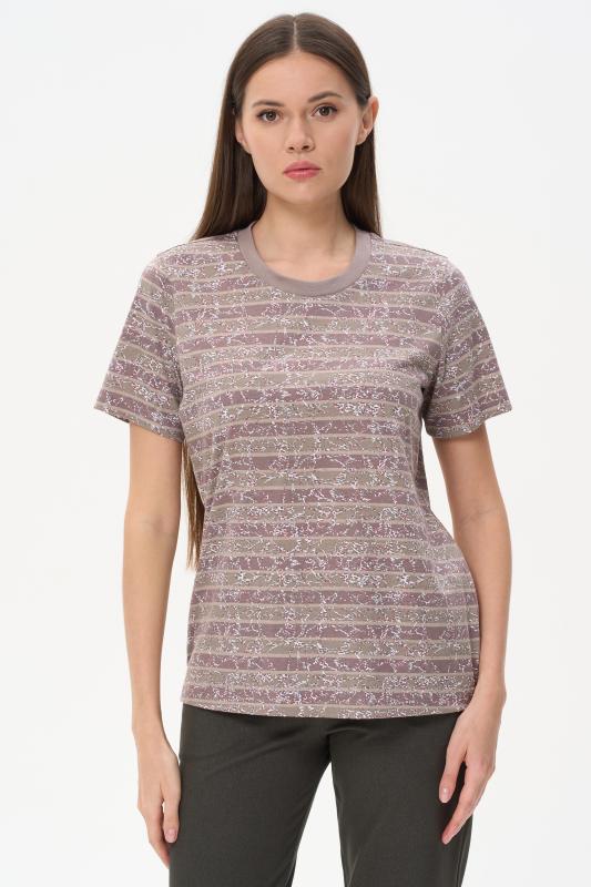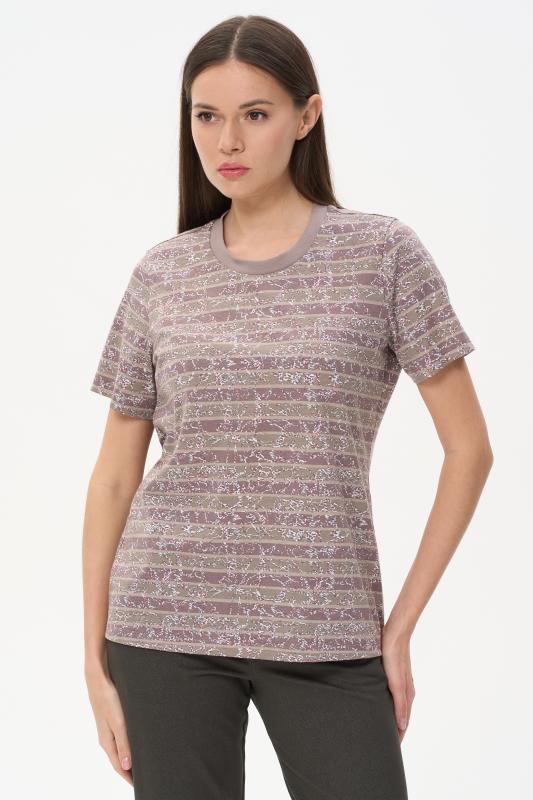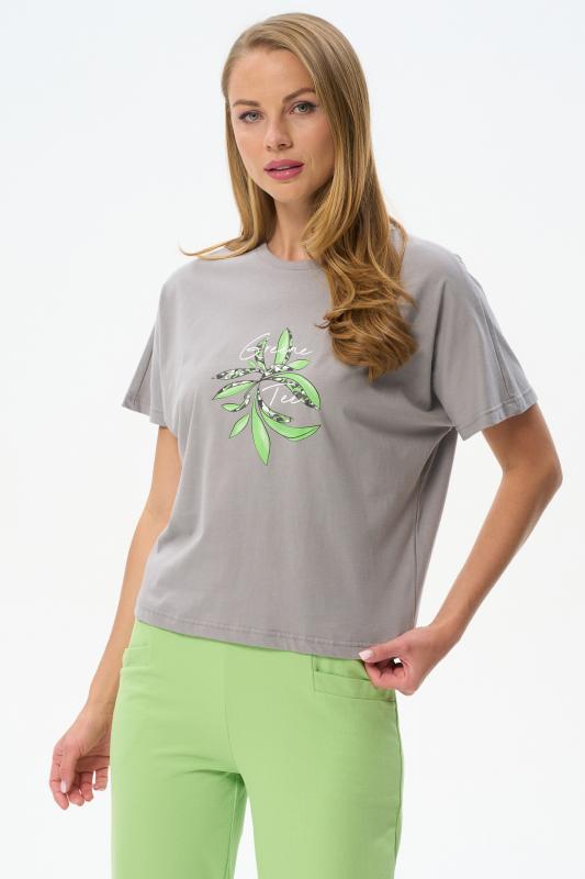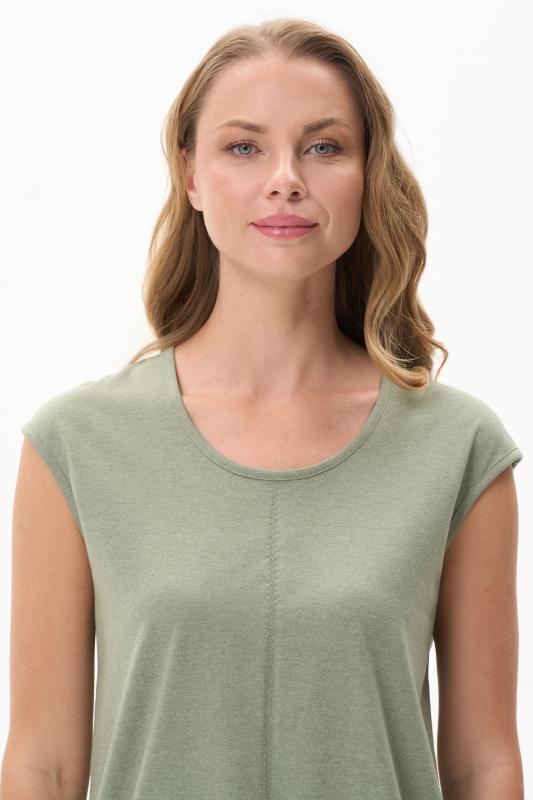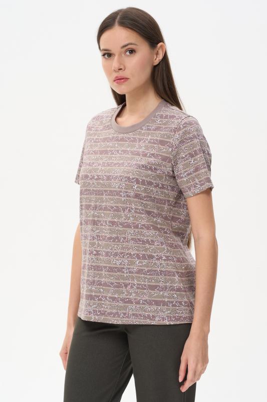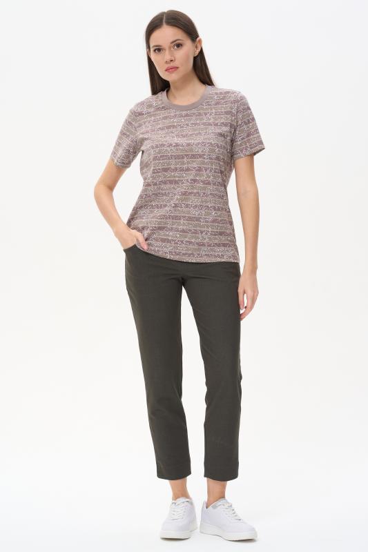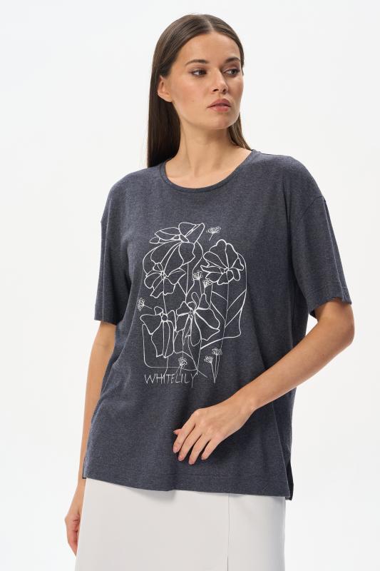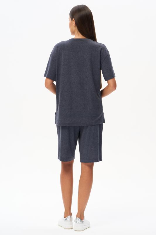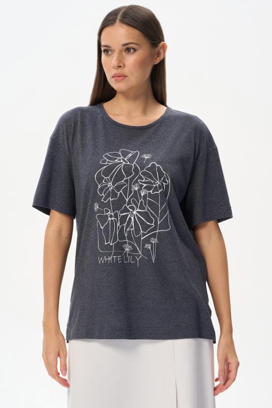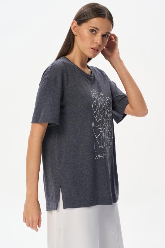 Футболка выполнена из хлопкового меланжевого трикотажного полотна. Средние швы полочки и спинки декорированы мережкой. Модель с круглой горловиной и цельнокроеным коротким рукавом. Рост модели на фото 178см.