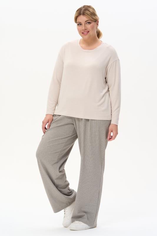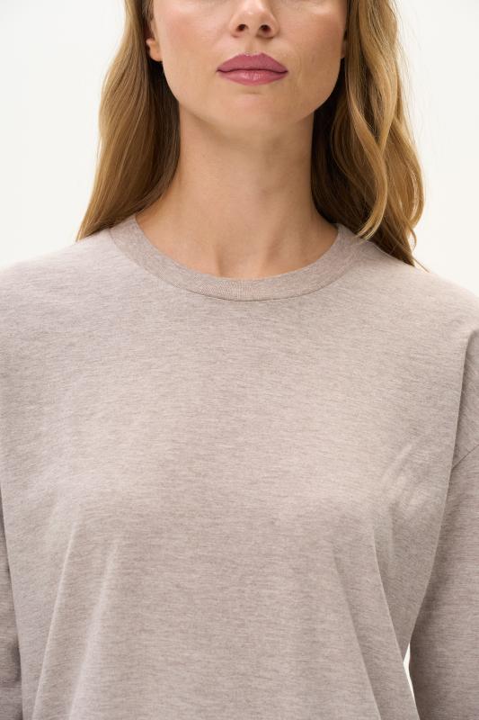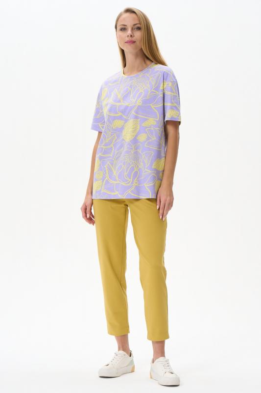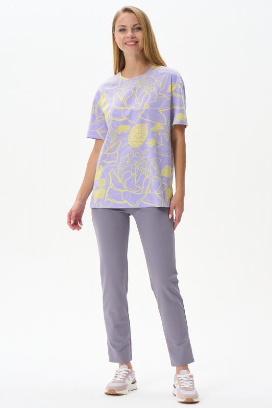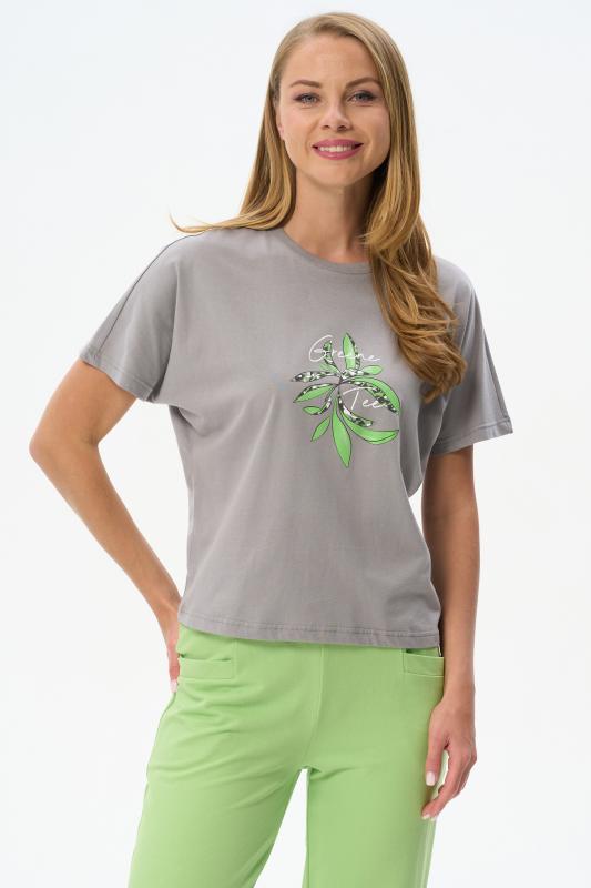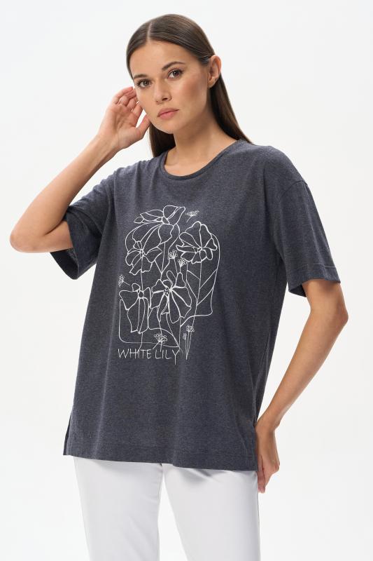 Футболка модного кроя из хлопкового трикотажного полотна. Свободный силуэт, длина до середины бёдер, втачные рукава. Круглый вырез горловины обработан хлопковым полотном рибана. Рост модели 175 см.