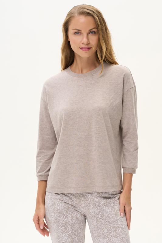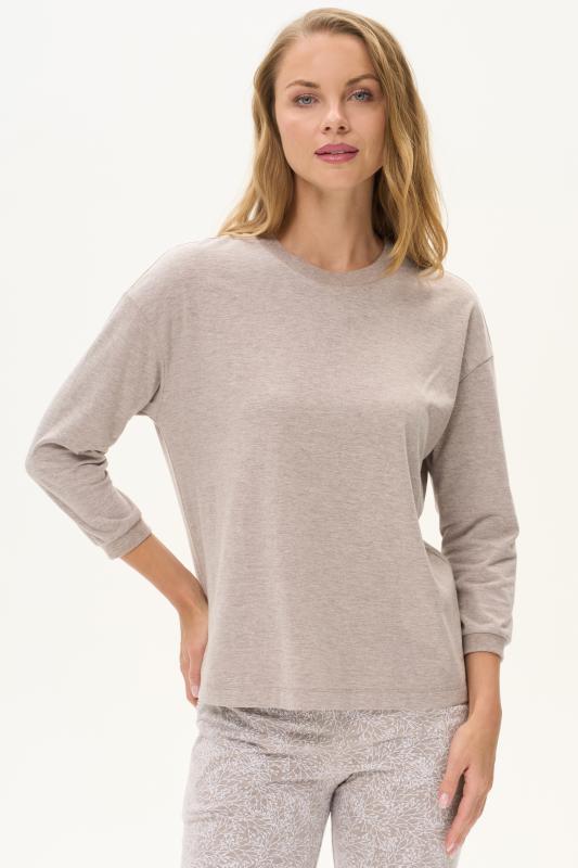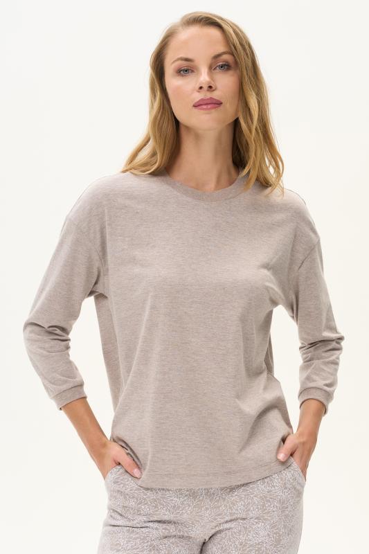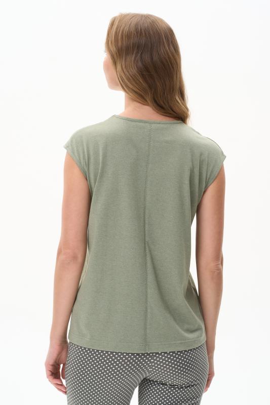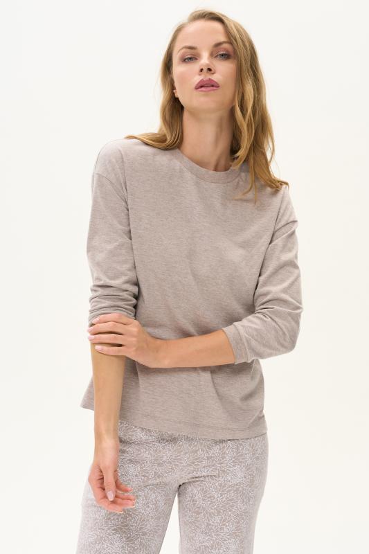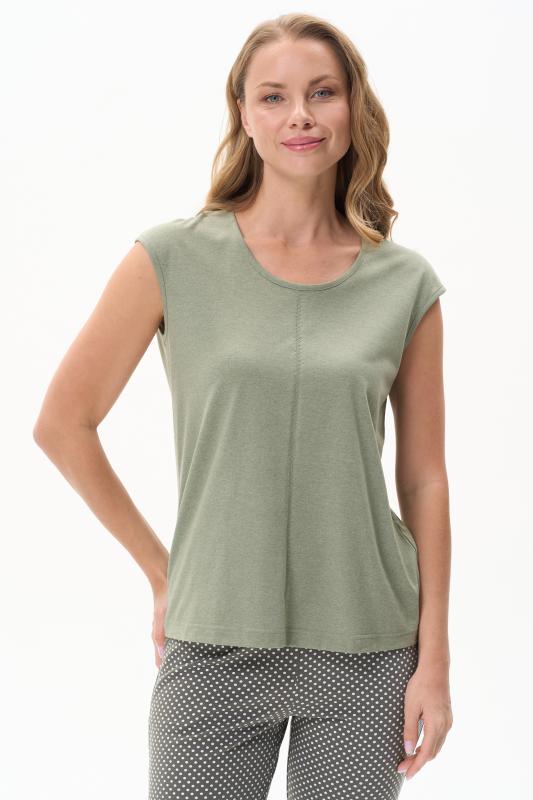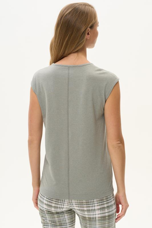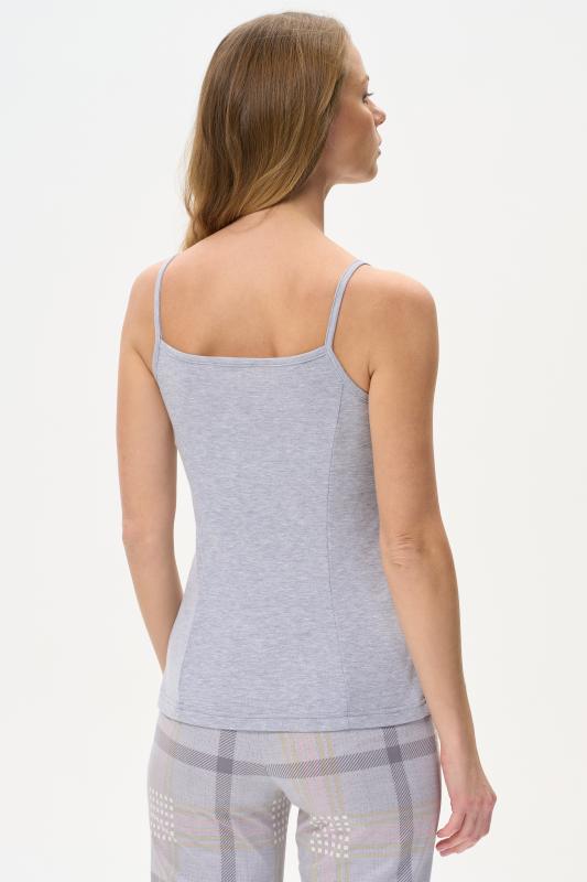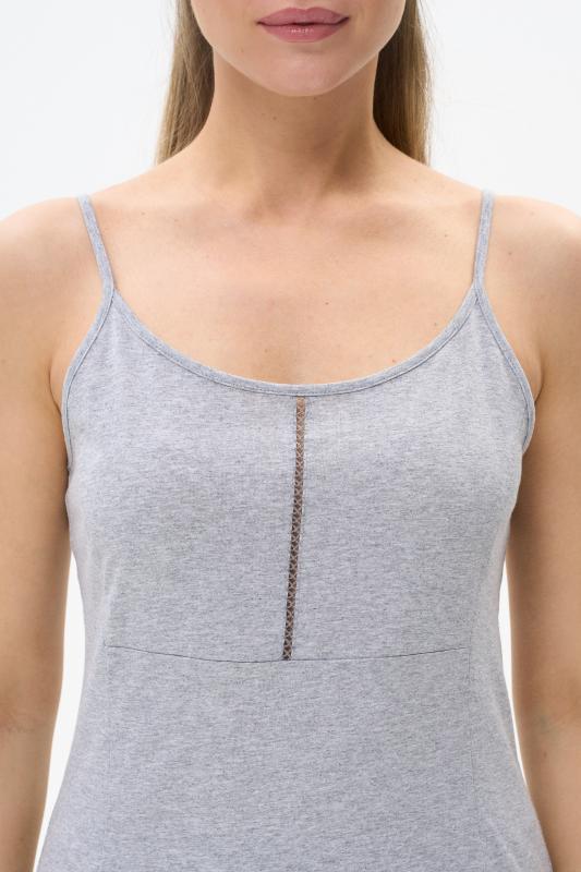 Майка из хлопкового меланжевого полотна. Круглый вырез горловины. Спереди подрез и средний шов декорирован мережкой. Рост модели на фото 175см.