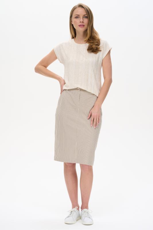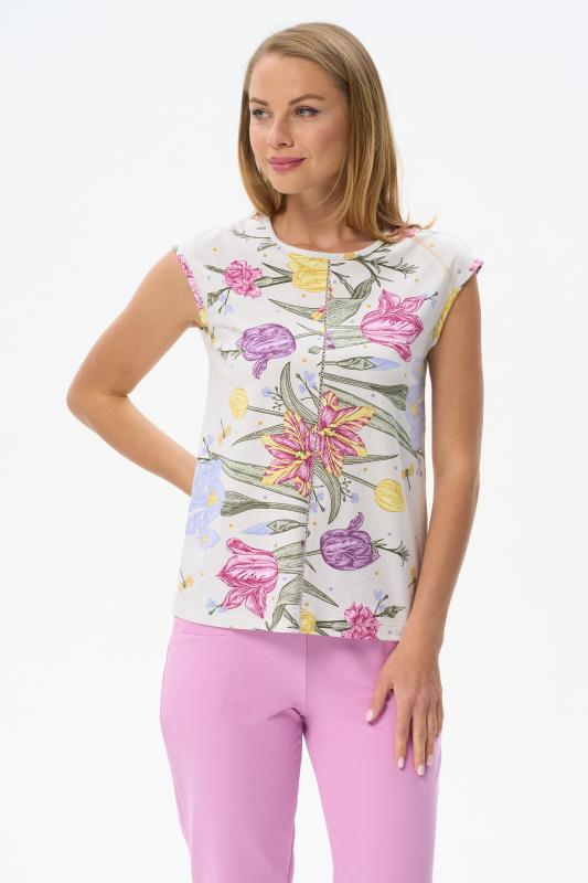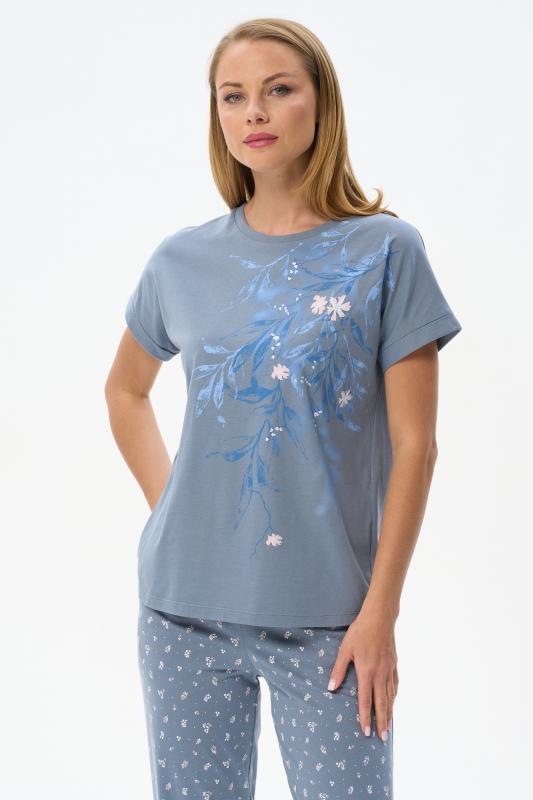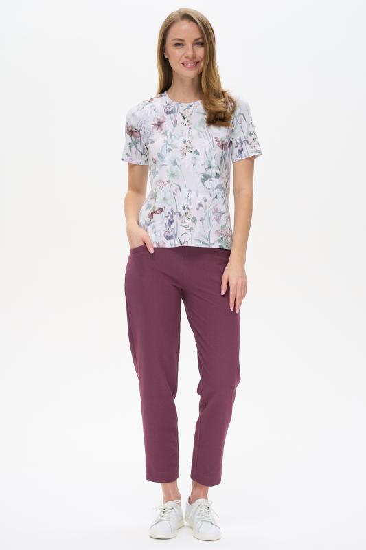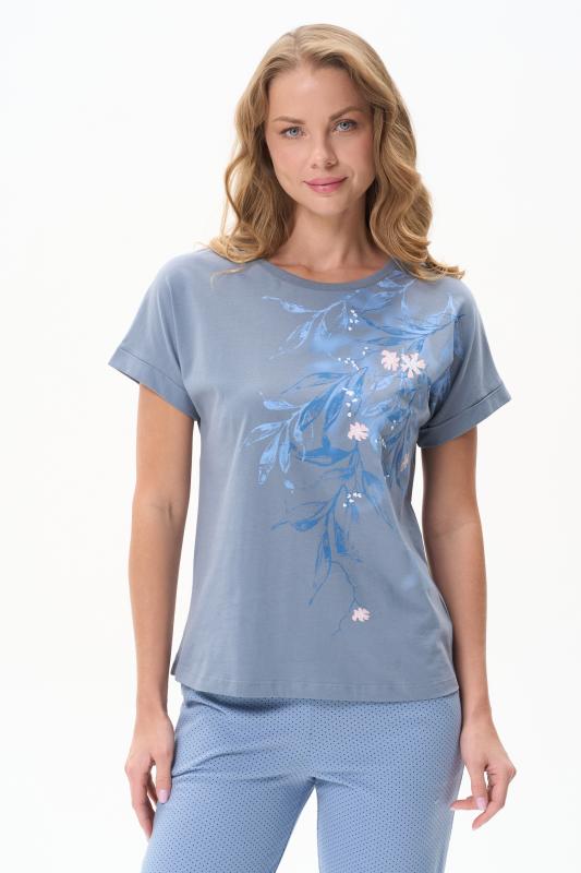 Футболка выполнена из хлопкового трикотажного полотна и декорирована мережкой. Модель с округлой горловиной и цельнокроеным коротким рукавом. Рост модели на фото 177см.