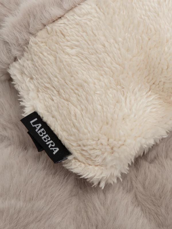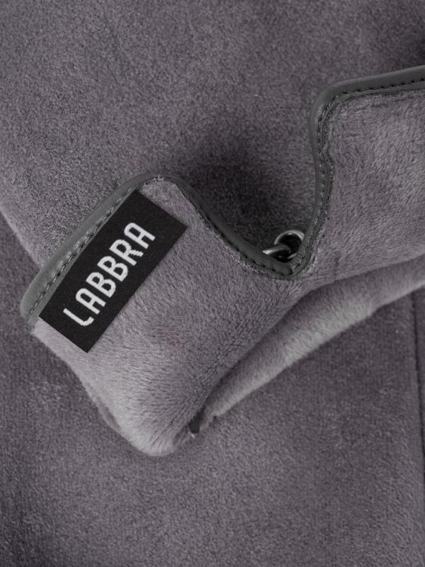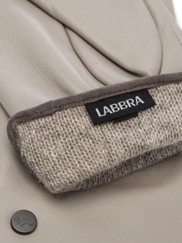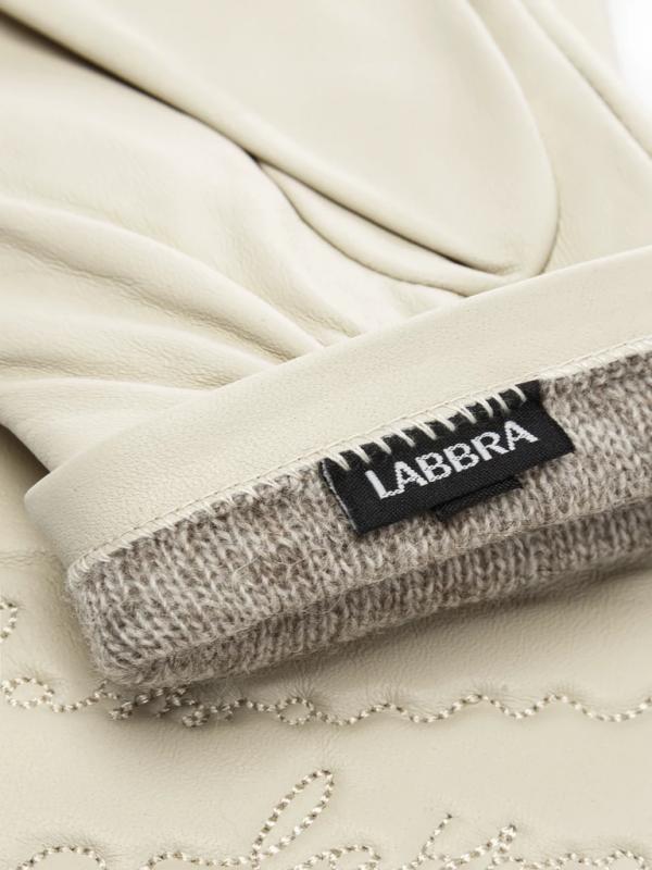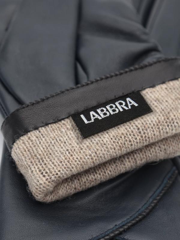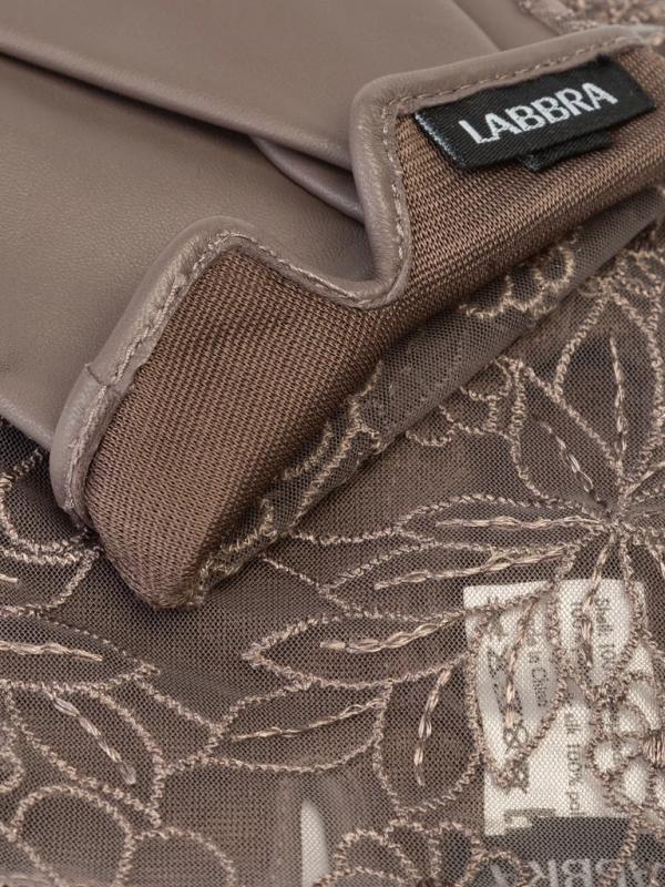 Перчатки женские торговой марки LABBRA производства Китай. Выполнены из натуральной кожи ягненка. Подкладка - 70% шерсть, 30% акрил. Отделка - горизонтальная декоративная отстрочка логотипом LABBRA на манжете. Длина манжеты от нижней точки большого пальца до края перчаток - 6,5 см. Длина пальцев - средняя.