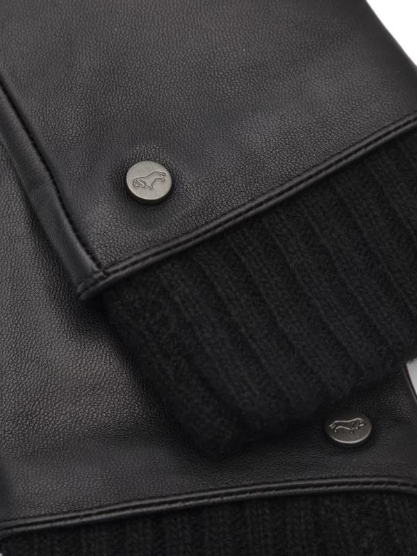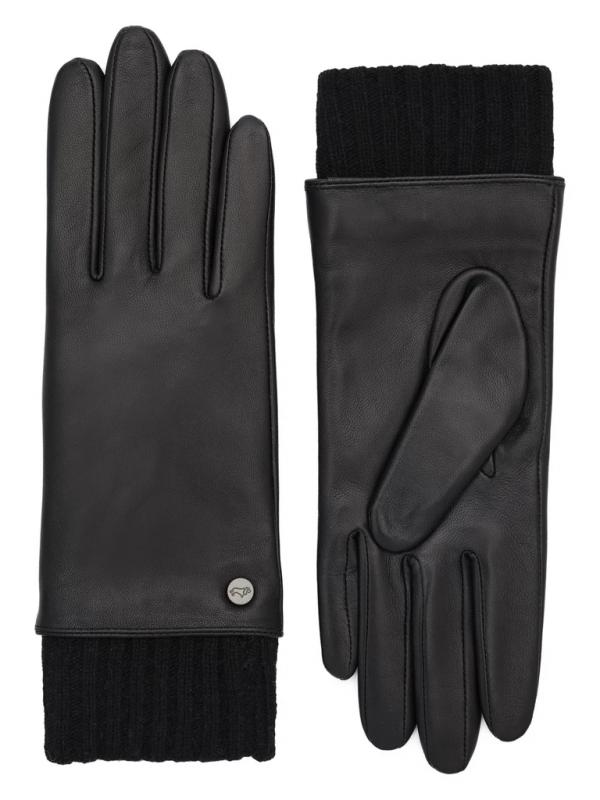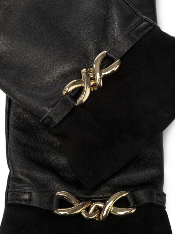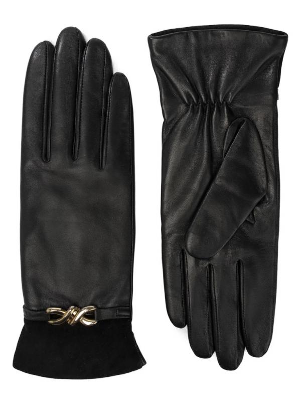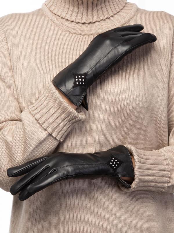 Перчатки женские торговой марки ELEGANZZA в черном цвете из натуральной кожи ягненка. Производство Китай. Подкладка: 100% шерсть. Декоративные элементы: фирменная фурнитура на фигурном ремешке