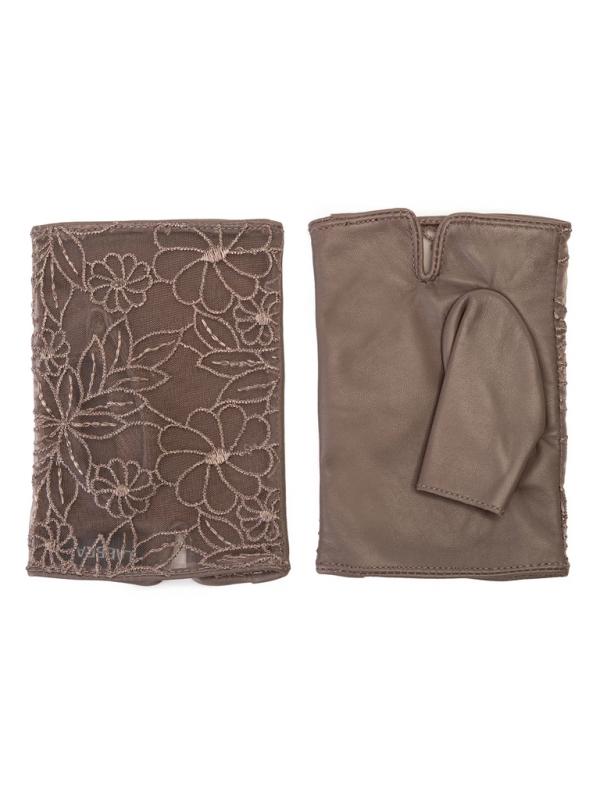 Митенки женские торговой марки LABBRA производства Китай. Ладонная часть выполнена из натуральной кожи ягненка, лицевая часть: из гипюра. Без подкладки. Длина манжеты от нижней точки большого пальца до края перчаток - 2,5 см.