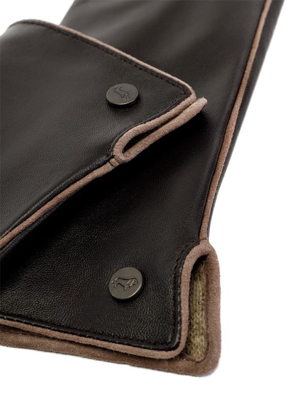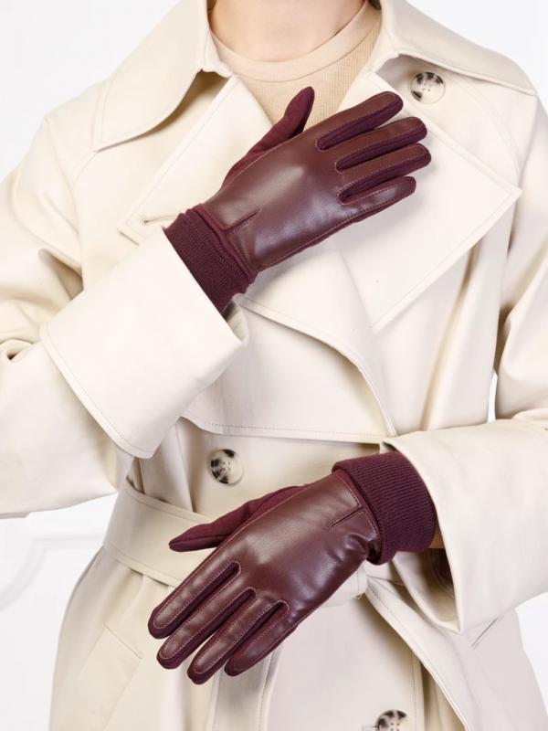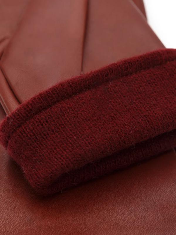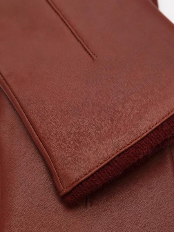 Перчатки торговой марки ELEGANZZA производства Китай, изготовлены из натуральной кожи коричневого цвета. Отделка - декоративные верникальный шов на лицевой стороне. Цветная подкладка: 70% шерсть + 30% кашемир выполнена в основной цвет перчатки. Длина манжеты от нижней точки большого пальца до края перчаток составляет 5 см. Пальцы средние.