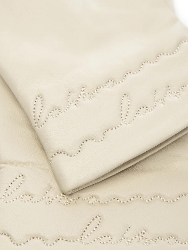 Перчатки женские торговой марки LABBRA производства Китай. Выполнены из натуральной кожи ягненка. Подкладка: 70% шерсть + 30% акрил. Отделка - декоративные машинные швы геметрической формы, украшенные хольнитенами. Длина манжеты от нижней точки большого пальца до края перчаток - 6 см. Длина пальцев - средняя.