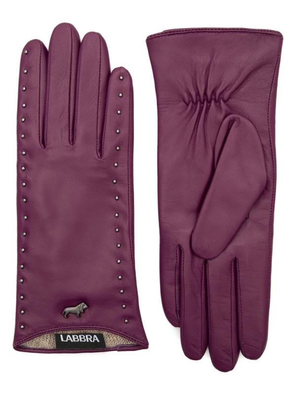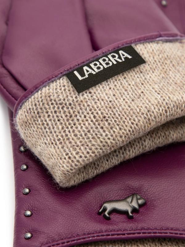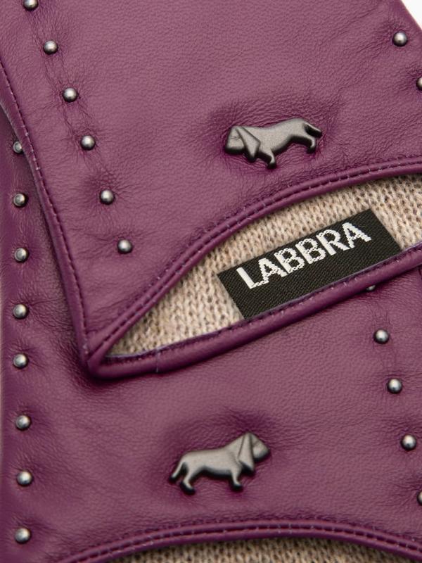 Перчатки женские торговой марки LABBRA из натуральной кожи ягненка. Производитель Китай. Подкладка: 70% шерсть, 30% акрил. Отделка - металлические хольнитены на бокой части печатки. Лицевая сторона украшена фурнитурой в виде фирменной символики бренда. Длина манжеты от нижней точки большого пальца до края перчаток - 6 см. Длина пальцев - средняя.