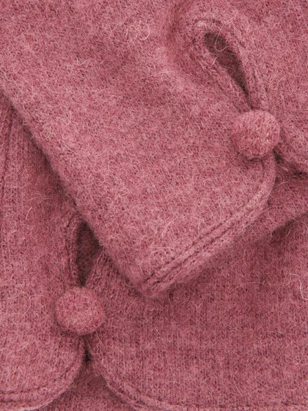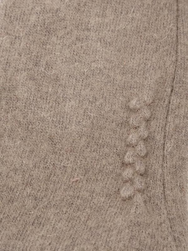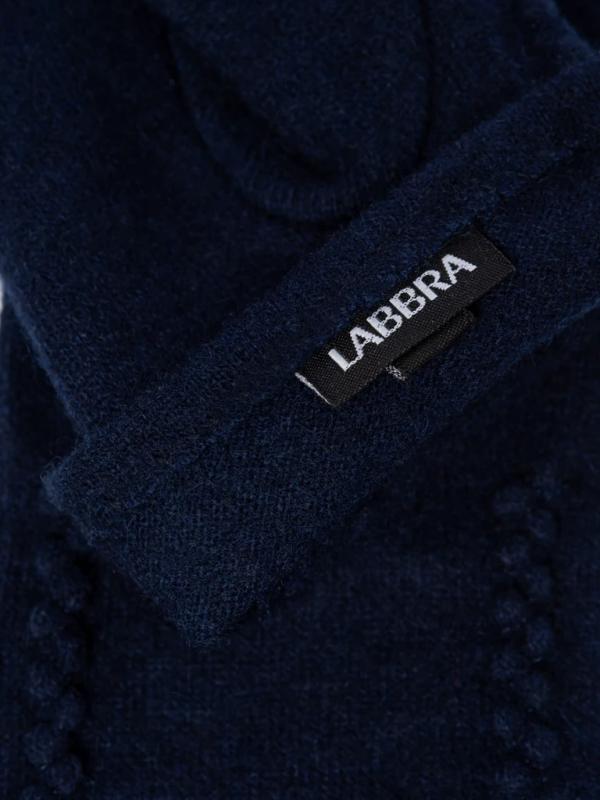 Перчатки торговой марки LABBRA производства Китай выполнены из трикотажной шерсти. Состав трикотажа: 80% шерсть, 20% нейлон. Без подкладки. Отделка - вырез в форме капли, украшенный пуговицей в тон, на лицевой стороне. Длина манжеты от нижней точки большого пальца до края перчатки 6 см. Длина пальцев - средняя.