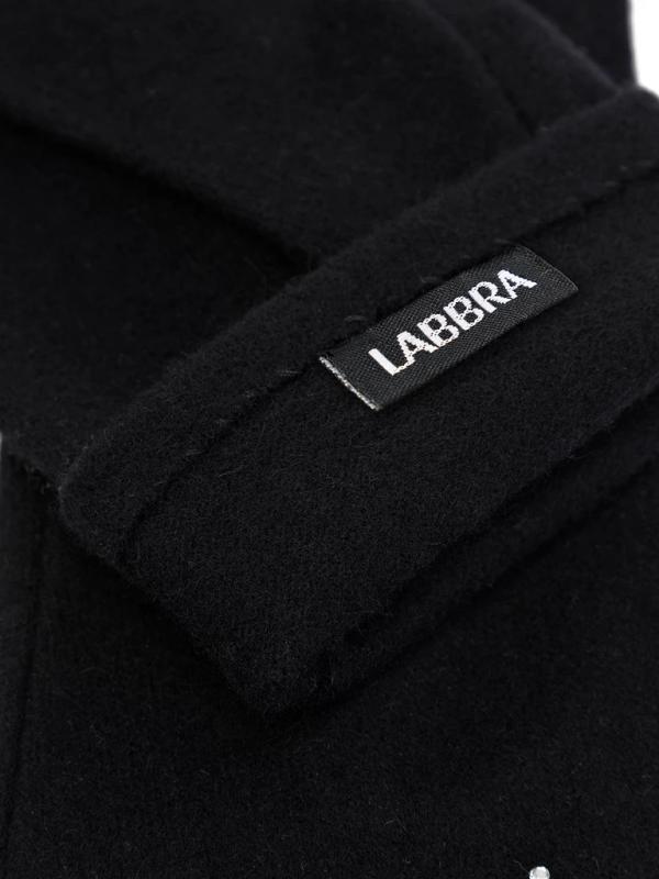 Перчатки торговой марки LABBRA производства Китай выполнены из трикотажной шерсти. Состав трикотажа: 80% шерсть, 20% нейлон. Без подкладки. Отделка - декор из страз на лицевой стороне. Длина манжеты от нижней точки большого пальца до края перчатки 6 см. Длина пальцев - средняя.