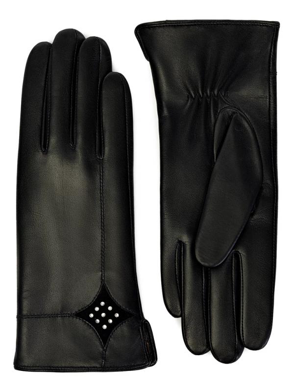 Перчатки женские торговой марки LABBRA производства Китай. Выполнены из натуральной кожи ягненка. Подкладка - 70% шерсть, 30% акрил. Декоративая вставка в форме ромба из велюра украшена белыми стразами. Длина манжеты от нижней точки большого пальца до края перчаток - 6,5 см. Длина пальцев - средняя.