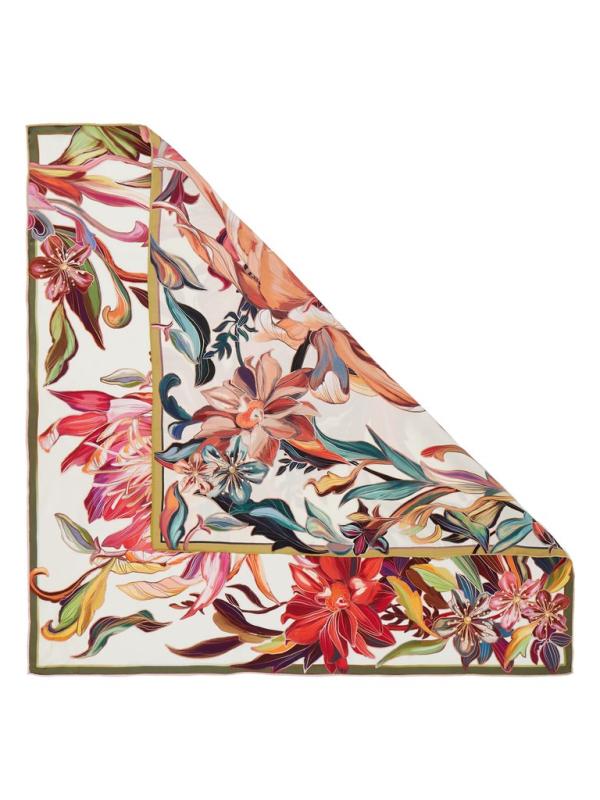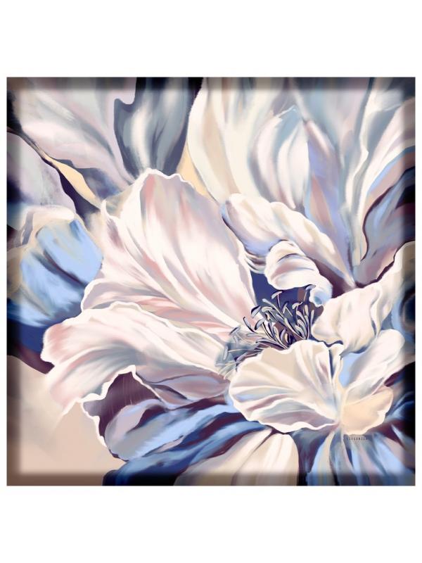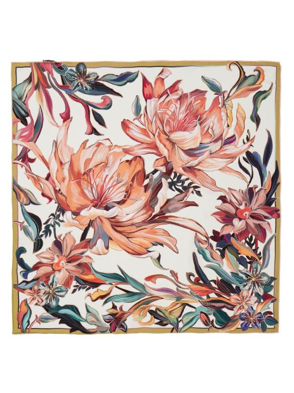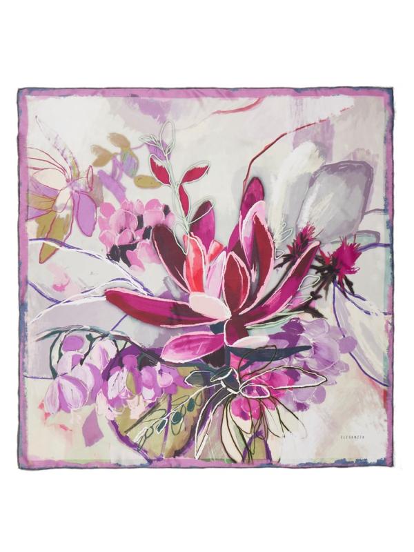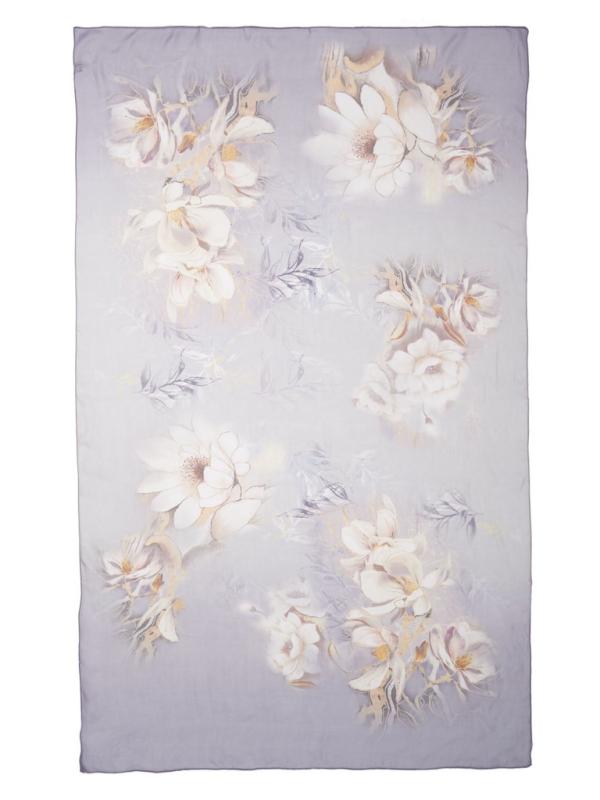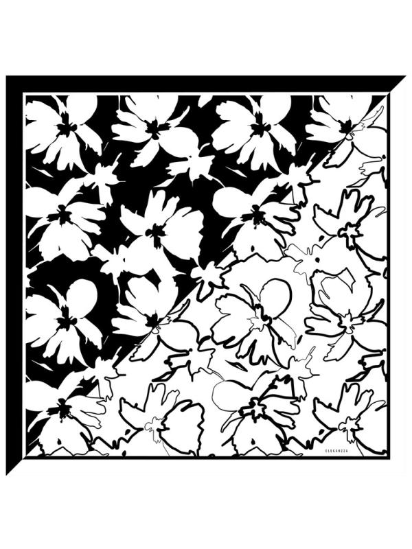 Женский платок торговой марки ELEGANZZA. Двусторонний платок с пышными раскидистыми цветами. По краям лепестков — эффект металлической заливки: будто тонкий слой золота или платины подчеркивает контур и добавляет принту ювелирное сияние.