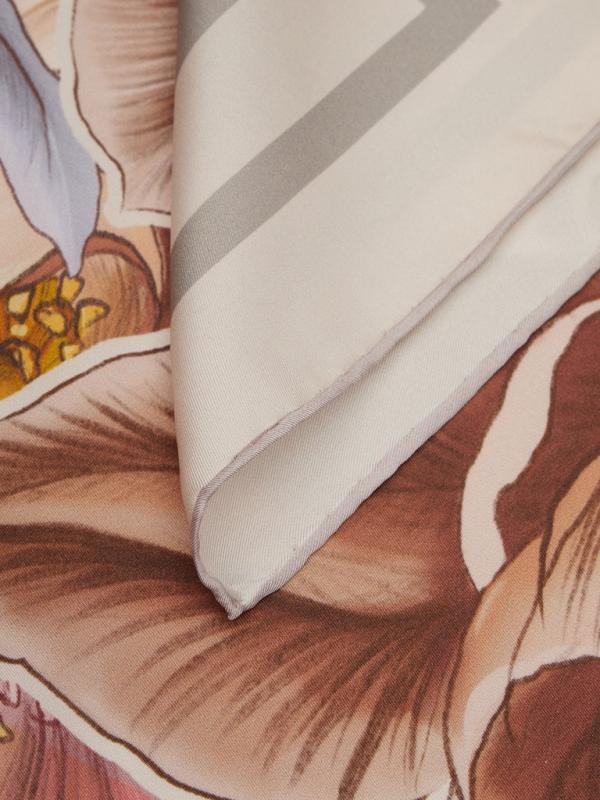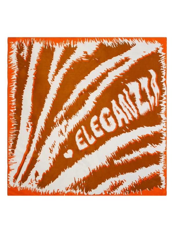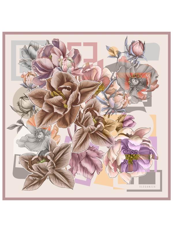 Женский платок торговой марки ELEGANZZA. Платок с цветочным коллажем, под которым проступают фрагменты логотипа: многослойная композиция сочетает мягкую флористику и графичную айдентику.