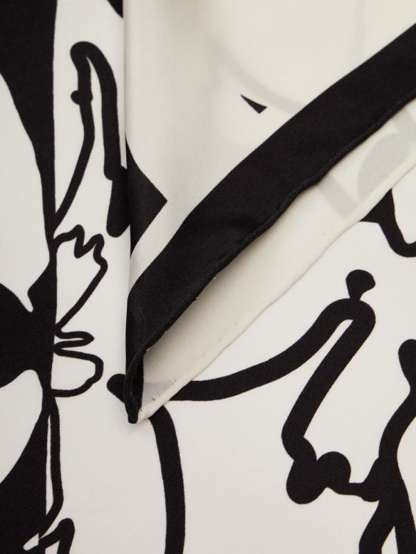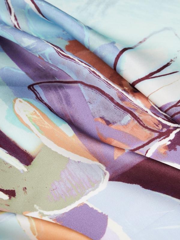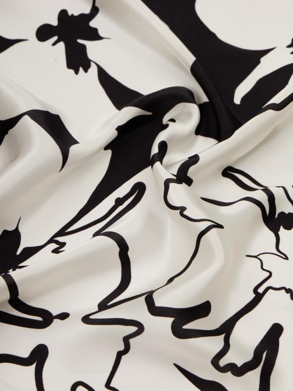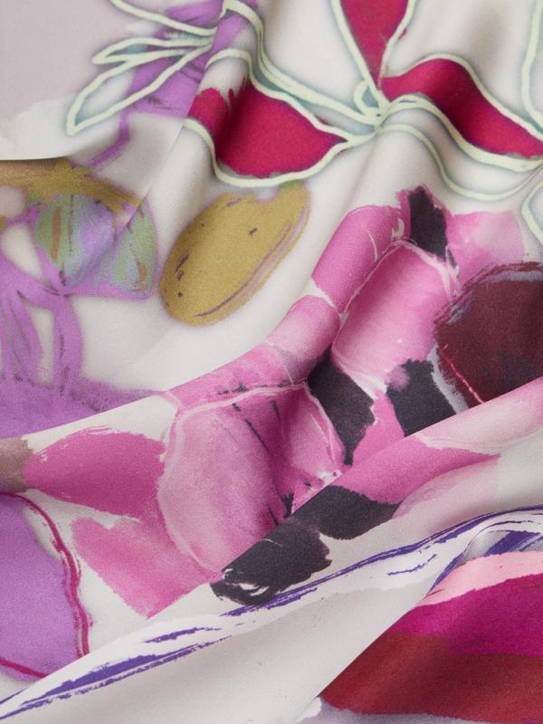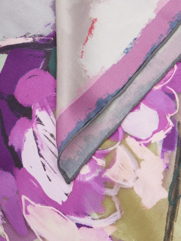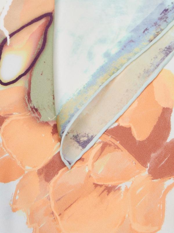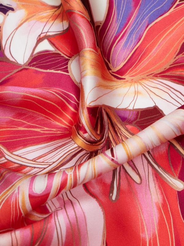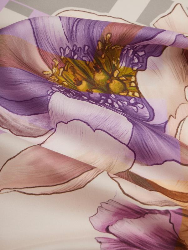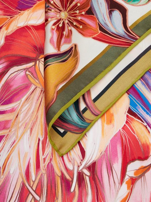 Женский платок торговой марки ELEGANZZA. Платок с парным цветочным принтом из коллекции бренда — тем же мотивом и цветовой гаммой, что и на одежде. Композиция разделена по диагонали цветовым блоком, создавая эффект колор-блок и подчёркивая рисунок.