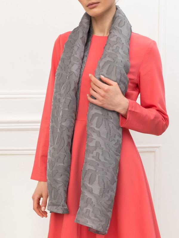 Женский платок торговой марки ELEGANZZA. Платок с парным дизайном к одежде из коллекции бренда: принт «горох» переосмыслен в неклассической статике — со смещённым ритмом и разным масштабом, за счёт чего композиция выглядит более живой и динамичной.