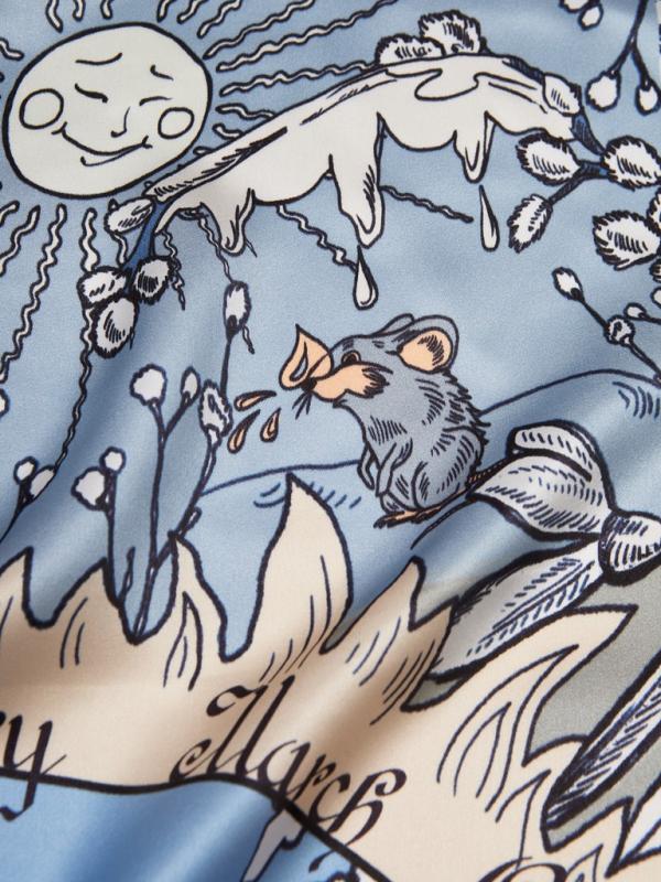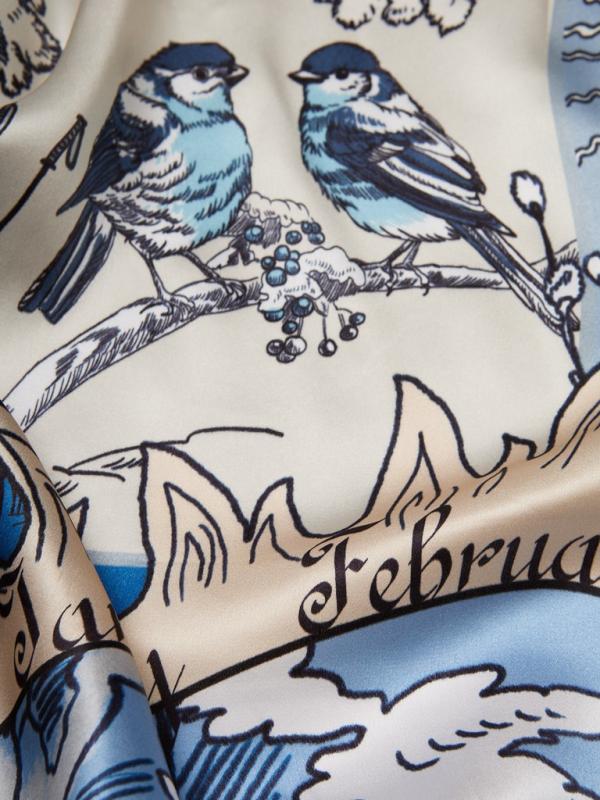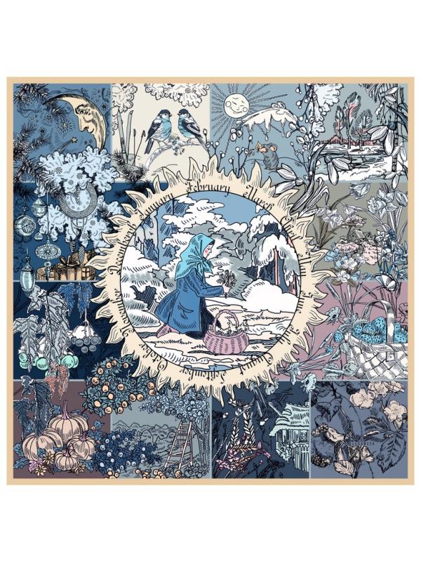 . Композиция состоит из 12 блоков - в каждом из которых характерная месяцу иллюстрация. По центру изделия расположилась главная героиня сказки, собирающая подснежники. Платок выполнен из натурального шелка.