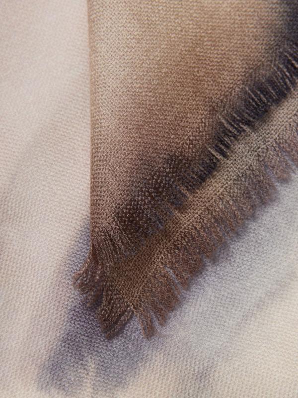 . На одной стороне палантина деликатный градиент, на другой - контрастный однотонный цвет. Края обработаны фабричной закрепкой с кисточками.