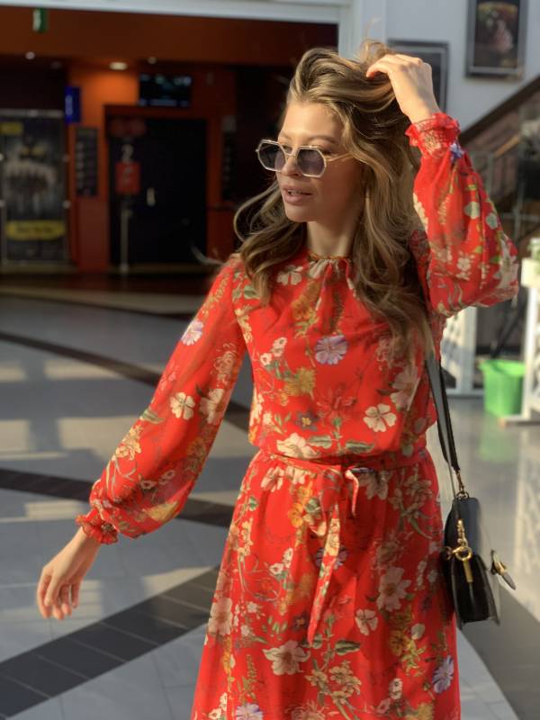 Платье выполнено из плотного принтованного трикотажа. Длина миди. Пояс съёмный, идёт в комплекте. Две полки, на которых пришиты 6 декоративных пуговиц, сшиты вместе. Платье сконструировано так, что его можно одевать пуговицами назад или наперёд. Экспериментируйте и создавайте разные образы! ЗАМЕРЫ ИЗДЕЛИЙ в размерах: 42 - 48см(ПОГ), 45см(ПОТ), 47см(ПОБ), 19см(Побхват плеча), 68см(длина рукава с учетом плеча), 111см(длина по переду от основания плеча)