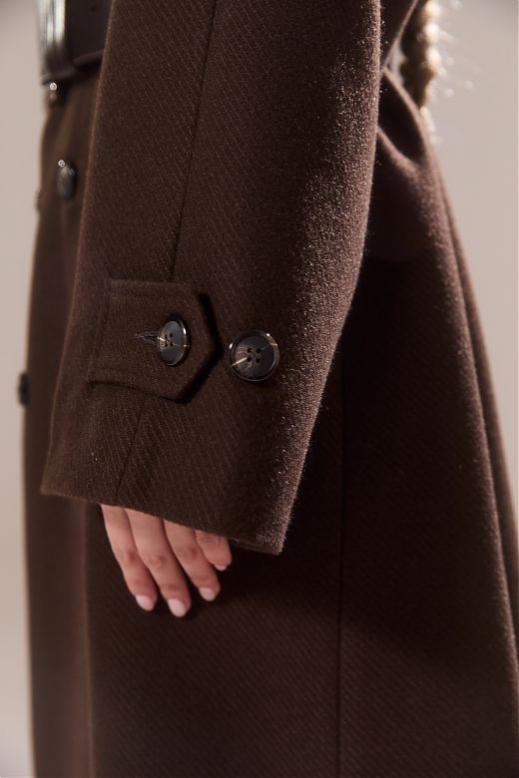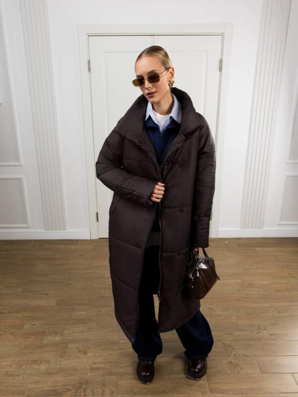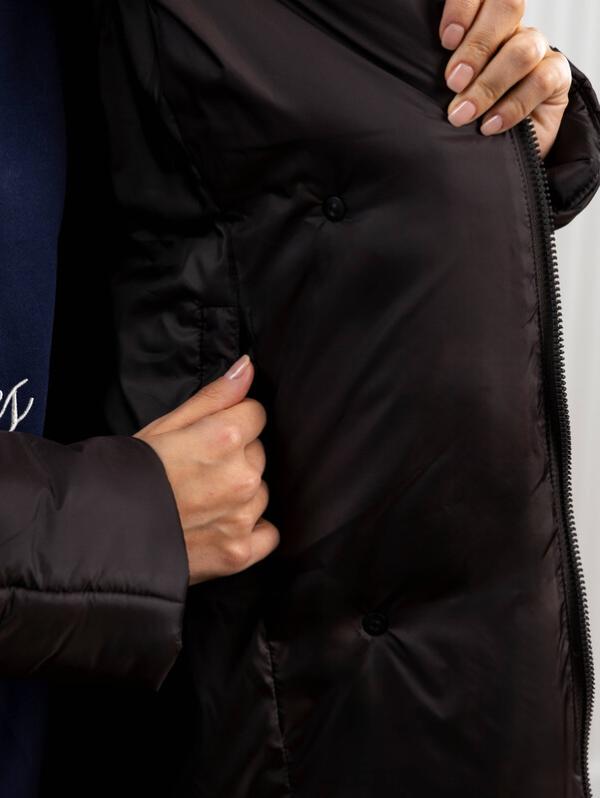 Двубортный пуховик прямого силуэта со съемным капюшоном, который крепится на потайные кнопки. Горловина изделия оформлена воротником с лацканами. Рукав со спущенным плечом. По низу рукава идет внутренняя ветрозащитная утяжка на резинке. Застежка на молнию и кнопки в тон изделия. В плаще имеются два кармана с листочками на магнитах и один внутренний карман. В комплекте с изделием идет пояс из основной ткани. Ткань - плащевая с водоотталкивающей пропиткой. Утепление Био-пух 250 гр. Рекомендуемый температурный режим (от 0°C до -20°C). Длина изделия: 115 см Длина рукава: 64 см.