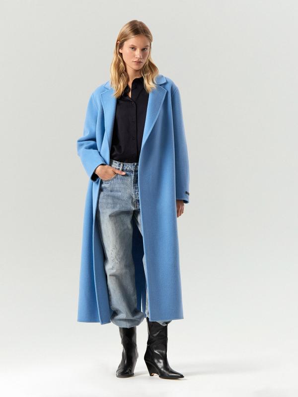 Пальто-жакет в тёмно-синем цвете станет базой демисезонных образов. Подойдёт в качестве верхнего слоя на начало осени или середину весны. Плотный материал более чем на 2-3 состоит из натуральной шерсти. Изделие выполнено на подкладке с высоким содержанием дышащей вискозы. Однобортная модель с английским воротником выражает тренд на сочетание фасонов классических офисных костюмов и пальтовых тканей.