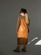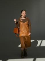 Красивое, универсальное, смелое. Комбинация из двух видов материала: мягкой эко-кожи и нежного велюрового трикотажа высокого качества. Теплое. Параметры Юли, модели на фото: 105-83-115, рост 165см. На ней 52 размер платья. При тестах ткань терли сильно - ворс немного приподнялся, кашлатки не появились. Все же это трикотаж, так что есть вероятность закошлачивания от механического трения с фурнитурой сумки или негладкой подкладкой куртки или жакета. Для сохранения первоначального вида платья рекомендуем такое трение свести к минимуму. По замерам: 100% совпадение возможно, но допустимы отклонения. Ориентировочные замеры по изделию: 52 - 57см(ПОГ), 58см(ПОТ), 59см(ПОБ), 18,5см(полуобхват плеча), 63см(длина рукава по внешней стороне), 114см(длина по центру спинки)