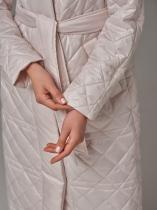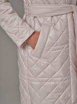 Стеганый плащ-кимоно прямого силуэта. Рукав реглан с заниженной проймой. Застежка на потайные кнопки. В изделии два кармана, оформленных листочками на потайных кнопках и один внутренний карман. В комплекте с плащом идет пояс из основной ткани. Ткань плащевая с водоотталкивающей пропиткой, простеганная ромбом. Утепление нового поколения ORSOTHERM 100 г-м2. Рекомендуемый температурный режим(от +10°C до +18°C). Длина изделия -120 см. Длина рукава - 64 см.