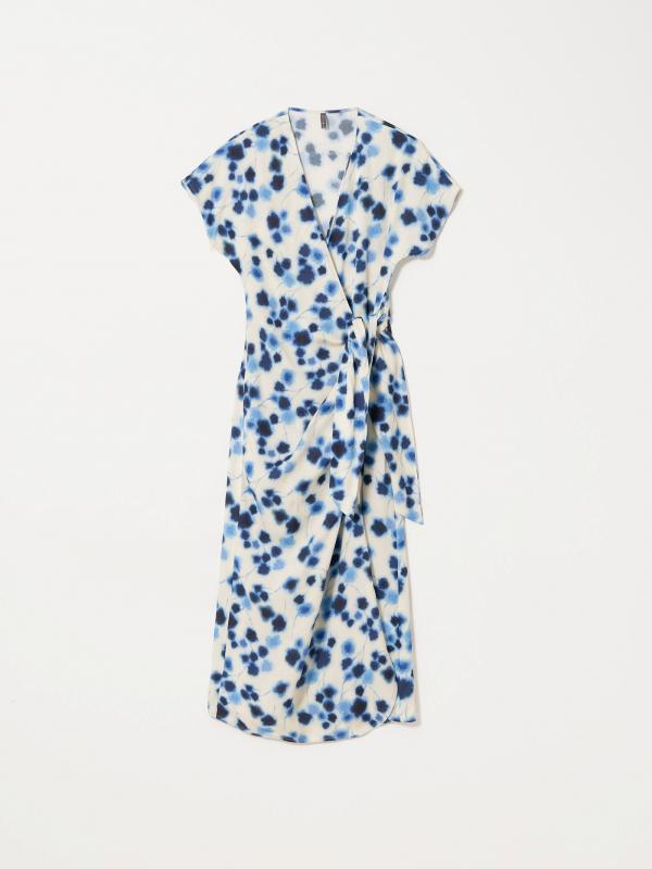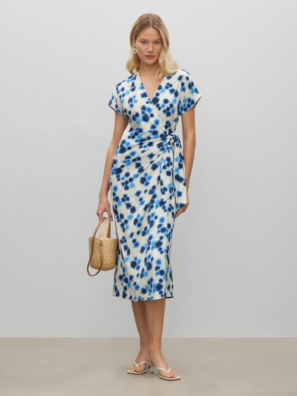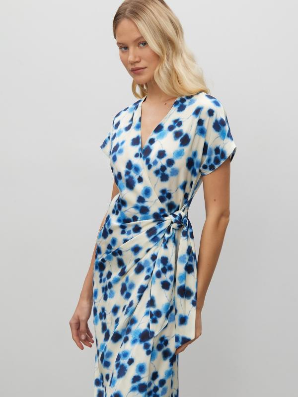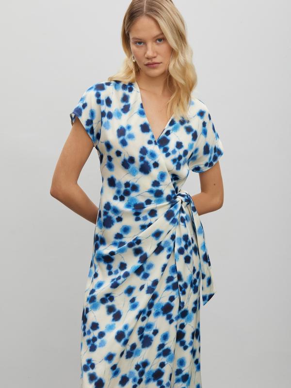 Элегантное белое платье с абстрактным принтом в ярких оттенках синего. Стройнит и вытягивает силуэт, позволяет эффектно продемонстрировать стройность ног. Короткие рукава смотрятся очень женственно и мягко. Модель с запахом и узлом в области талии имеет треугольный вырез. Универсальное платье подойдёт на любой случай. Можно надеть на на конференцию или в театр, в ресторан, на работу. Изделие выполнено из вискозы, без подкладки.