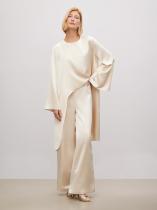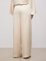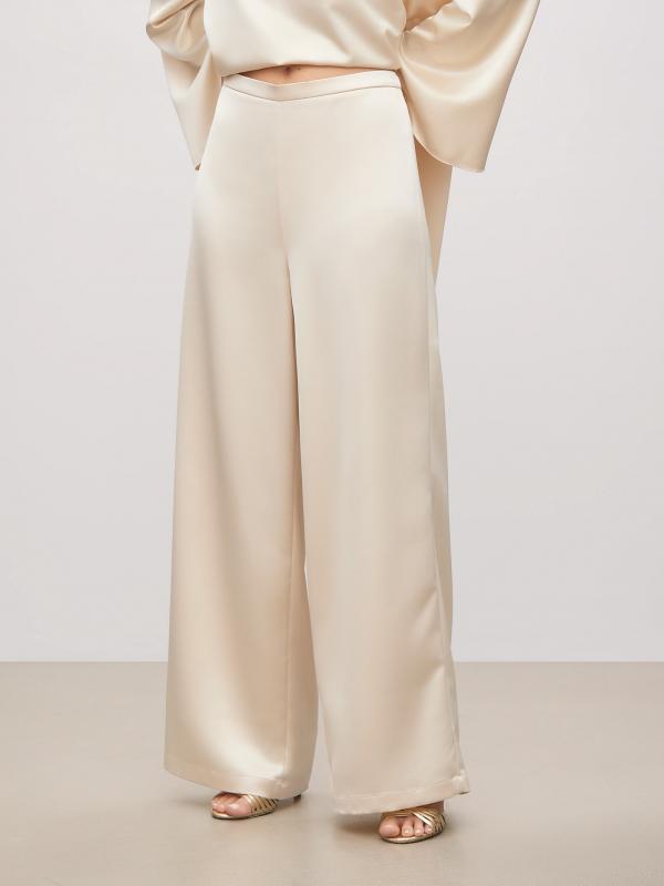 Брюки-палаццо из молочного атласа для самых роскошных образов. Мягкий крой, не стесняющий движений, лёгкий шелковистый материал и волнующая фактура помогут разбудить в себе чувственность. Резинка сзади делает посадку ещё более комфортной. Дополнить брюки можно эстетской блузой из комплекта или лёгким сатиновым топом на широких бретелях.