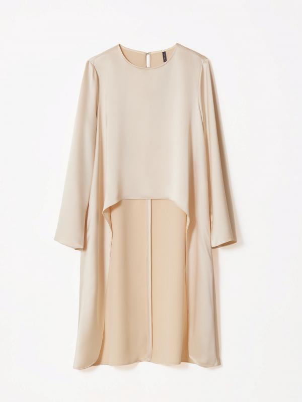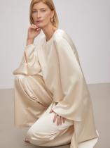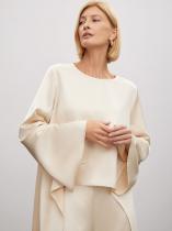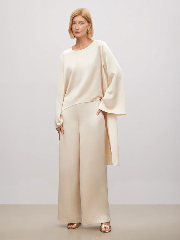 Роскошная блуза для особого настроения. Молочный атлас окутывает ощущением женственности. Ткань красиво ниспадает вдоль тела, элегантно драпируется, подчёркивая динамику. Сильно удлинённая со спинки и боков модель с просторными, расширяющимися книзу рукавами создаёт впечатление лёгкости и свободы. Деликатный вырез-капля под застёжкой и разрезы на рукавах дополняют картину артистичного, вдохновенного и чувственного образа. Идеальный вариант для свидания с собой в уютном кафе или SPA, девичника, фотосессии. Может быть концертным костюмом или нарядом на свадьбу.