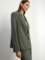 Жакет цвета хаки для модных повседневных образов. Выполнен из материала с содержанием шерсти: её чуть меньше половины. Модель прямого кроя отличают расширенная линия плеч и дополнительный объем в этой области. Однобортную модель также дополняют английский воротник и узкие карманы с листочкой. Завершить образ с жакетом можно брюками из комплекта.