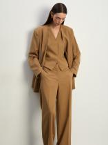 Брюки бежевого цвета для модных повседневных образов. Выполнены из материала с содержанием шерсти: её чуть меньше половины. Свободная модель прямого кроя имеет высокую посадку. Дополнена широкими шлёвками для ремня. Сзади располагается один декоративный узкий карман с листочкой. Завершить образ с брюками можно стильными жакетом и жилетом из комплекта и базовой водолазкой.