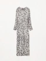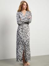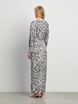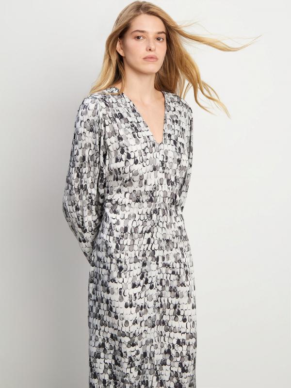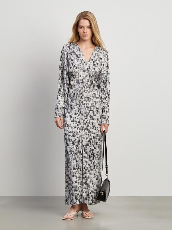 Универсальное платье с модным абстрактным принтом в светлых и пепельных тонах. Подойдёт на каждый день и к особому случаю. Модель приталенного кроя в длине миди имеет длинные рукава, V-вырез и глубокий разрез на юбке. Изделие выполнено из приятной к телу вискозы, без подкладки.