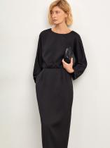 Черное платье с трендовыми акцентами. Сверху от отрезной талии расходятся сборки, а снизу — защипы. Низ рукавов также украшен сборкой. Спинка на запах с акцентными пуговицами дополнена небольшим треугольным вырезом и изящной кокеткой под ним. В нижней части платья расположена молния. На юбке предусмотрена глубокая шлица. Платье выполнено из тактильно приятного материала с содержанием вискозы.