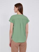 Рубашка мятного цвета разнообразит повседневные образы. Изготовлена из лёгкого материала с содержанием вискозы, имеет креповую фактуру. Модель прямого кроя с коротким рукавом и V-образным вырезом подойдёт на любую фигуру. На спинке имеется кокетка со складкой. Изделие выполнено из материала с содержанием вискозы, без подкладки.