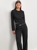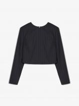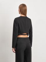 Блуза из чёрной костюмной ткани в полоску сочетает в себе элементы офискора и дерзкую игру с длиной. Трендовая модель отличается укороченной спинкой и перемычкой сзади. Хорошо сочетается с джинсами и брюками высокой или средней посадки, в том числе брюками из комплекта. Блуза выполнена на подкладке с вискозой. Застёгивается на кнопки. Образ с блузой можно дополнить брюками из комплекта.