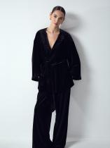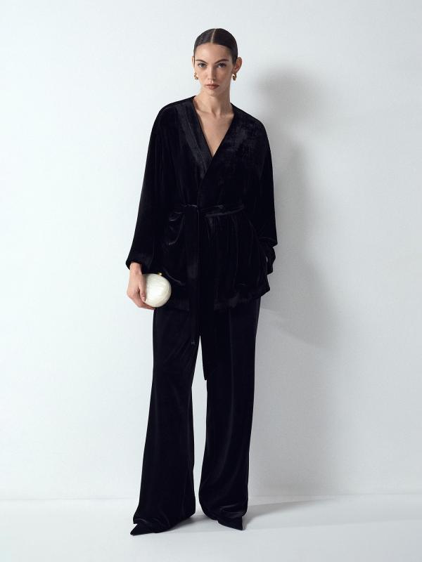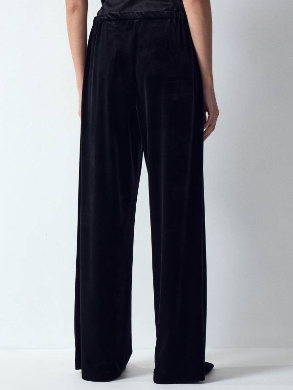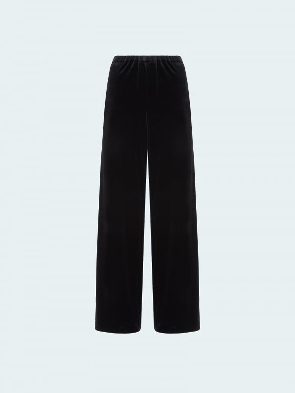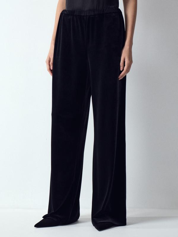 Брюки из бархата с его соблазнительной мягкостью, нежностью и эффектными переливами — роскошный выбор для любого праздника. Такую вещь захочется носить каждый день, к чему располагают базовый цвет и отсутствие лишних деталей. Модель отличается удобной посадкой на резинке. Брюки восхитительно комфортны и приятны к телу. Выполнены без подкладки. Завершить образ с бархатными брюками можно жакетом-кимоно из комплекта или атласным топом.