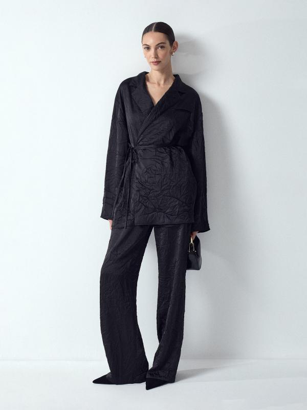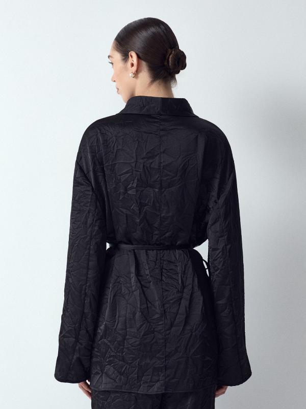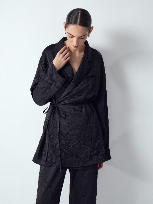 Чёрное кимоно из гладкого материала с жатым эффектом создаст непринуждённый образ для вечеринки или выходного дня. Дополнено завязкой в талии, что позволяет подогнать вещь под свои параметры парой движений. Кимоно выполнено без подкладки, подходит в качестве второго слоя. Лучшее сочетание — с базовым топом и брюками из комплекта.