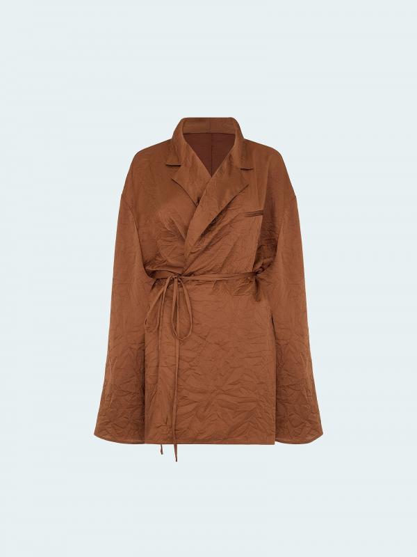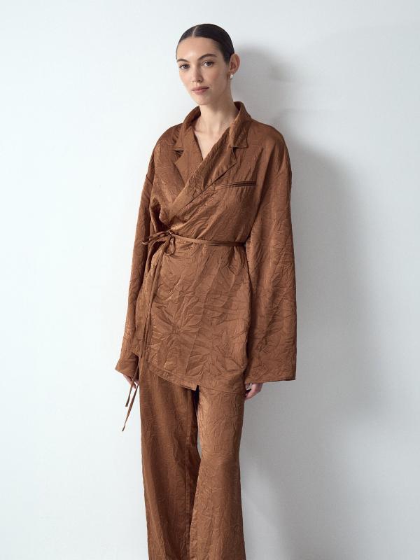 Золотисто-коричневое кимоно из гладкого материала с жатым эффектом создаст непринуждённый образ для вечеринки или выходного дня. Дополнено завязкой в талии, что позволяет подогнать вещь под свои параметры парой движений. Кимоно выполнено без подкладки, подходит в качестве второго слоя. Лучшее сочетание — с базовым топом и брюками из комплекта.