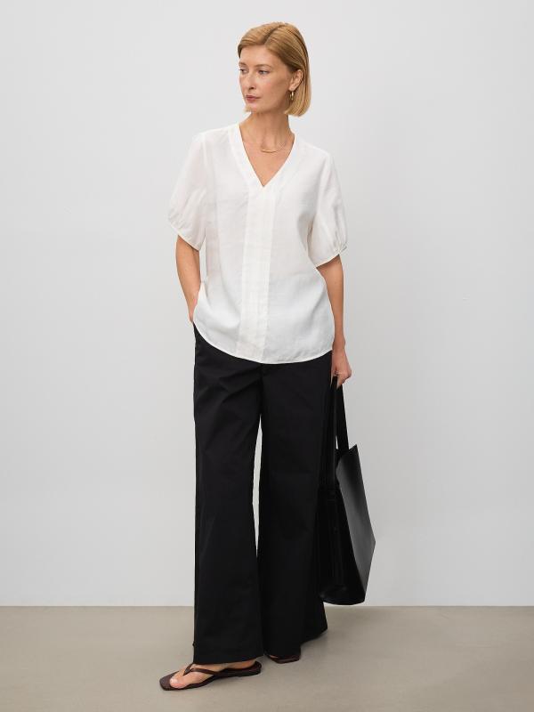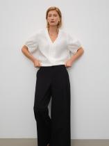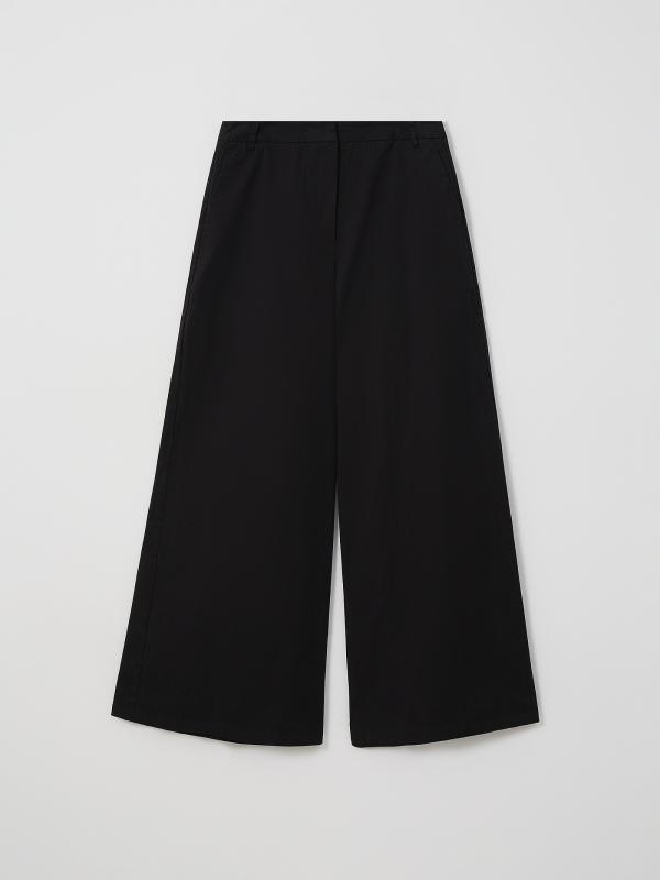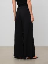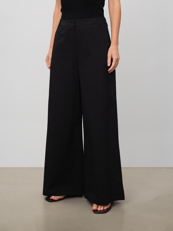 Брюки палаццо в чёрном цвете выполнены из плотного хлопка с добавлением эластана для более комфортной посадки. Идеальная модель для лето, свободная и стильная. Застёгивается на молнию. Брюки можно носить с трикотажными или атласными топами. Изделие изготовлено без подкладки.