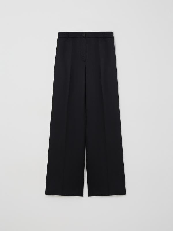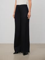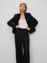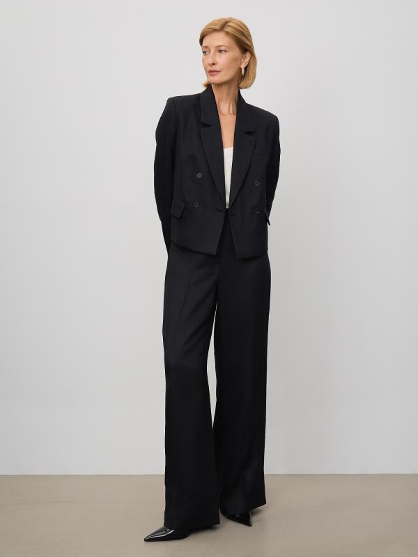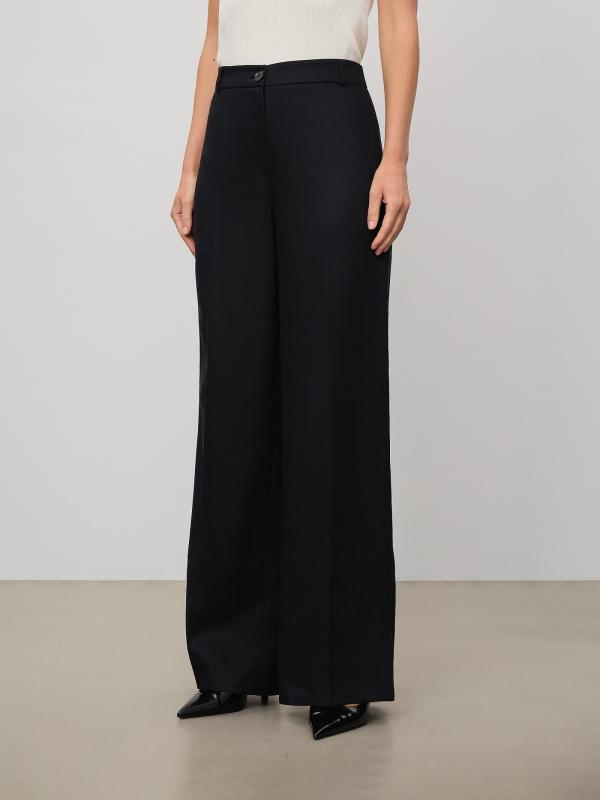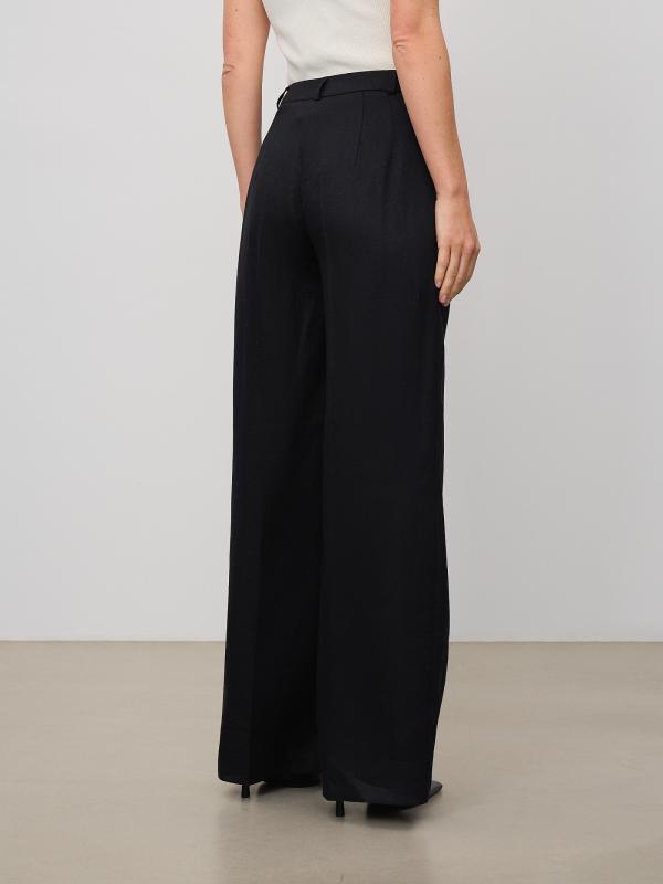 Стильные чёрные брюки с лёгким блеском выполнены из льна и вискозы. Модель широкого кроя имеет высокую посадку. Сзади имеются декоративные швы, визуально формирующие изящный силуэт. Застёгивается на пуговицу в тон и молнию. Предусмотрены шлёвки для ремня. Базовая модель незаменима в гардеробе и сочетается с любым верхом, в том числе жакетом из комплекта.