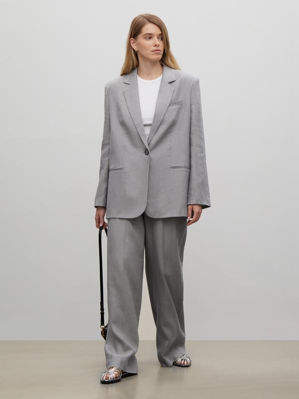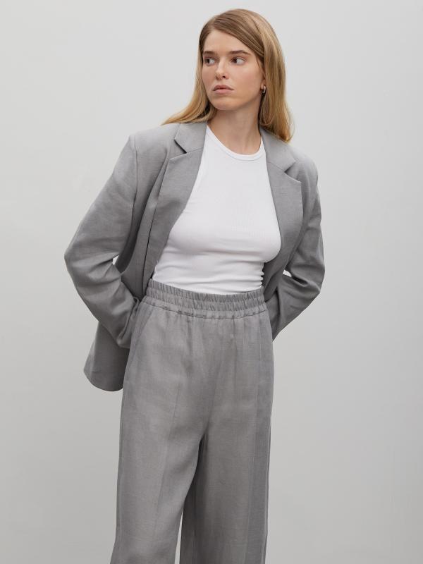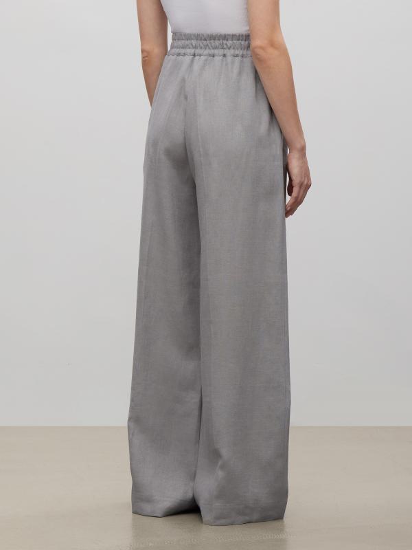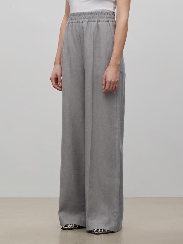 Стильные брюки изо льна в сером цвете. Модель на комфортной широкой резинке с высокой посадкой имеет широкий крой и полную длину. Образ с брюками в стиле кэжуал-шик можно дополнить атласной рубашкой или базовым трикотажем.