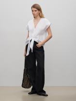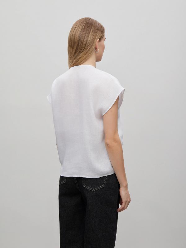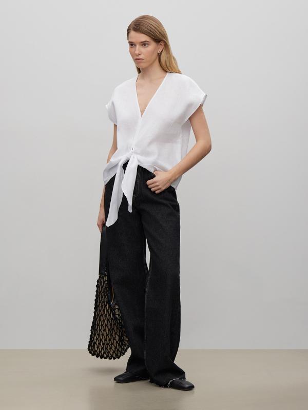 Лёгкая блуза из тонкого и мягкого льна окутает комфортом. Образ с ней будет очень женственным за счёт общей пластичности, соединения резких и плавных элементов. Модель имеет короткий спущенный рукав красивой формы и глубокий, но сужающийся книзу вырез, переходящий в узкую планку. Низ изделия выполнен в виде узла, что добавляет образу свободы.