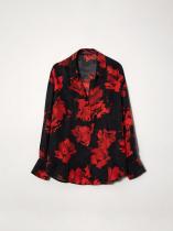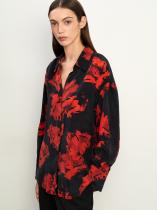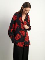 Рубашка со смелыми мазками алого цвета на чёрном фоне — модная вещь сезона. Выполнена из купры: это тактильно приятный, шелковистый материал на основе вискозы. Модель прямого кроя отличает спущенный рукав и планка на шлице. Шлицы рукавов декорированы пуговицами. На спинке имеется кокетка без складки. Изделие застёгивается на некрупные пуговицы. Рубашка отлично дополнит базовые брюки или джинсы.