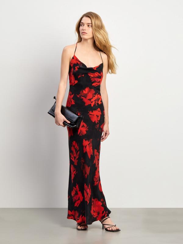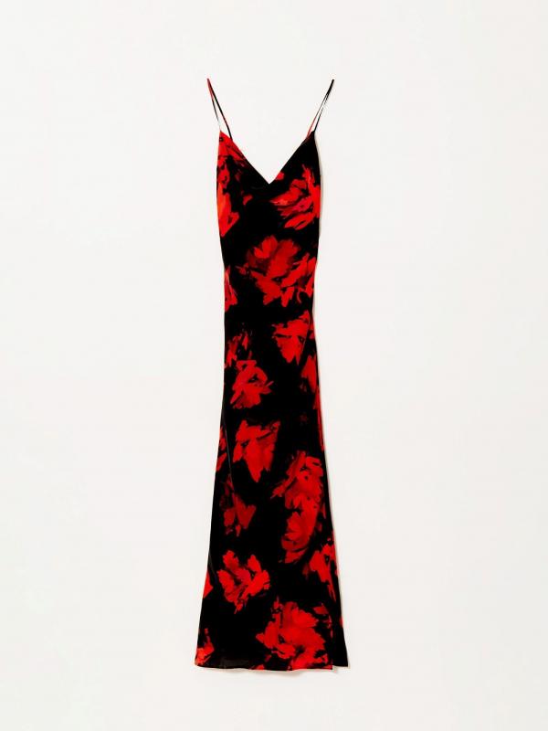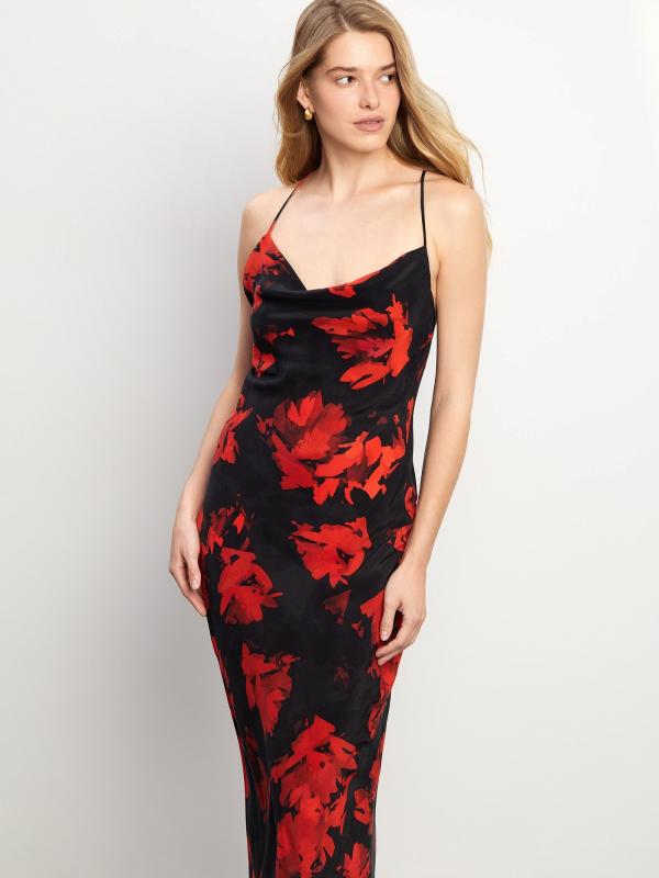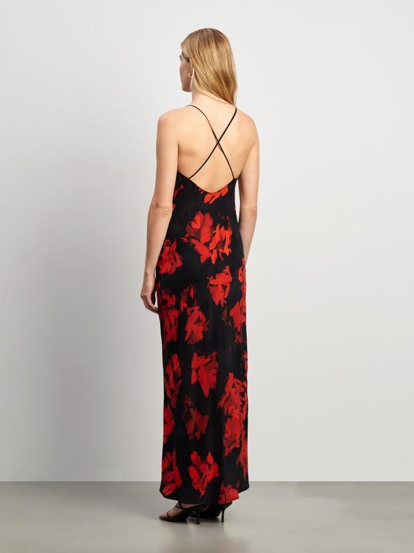 Платье макси со смелыми мазками алого цвета на чёрном фоне — модная вещь сезона. Изготовлено из купры: это тактильно приятный, шелковистый материал на основе вискозы. Комбинация выполнена на тонких бретелях, которые перекрещиваются на спинке. Открытая спина, женственная "