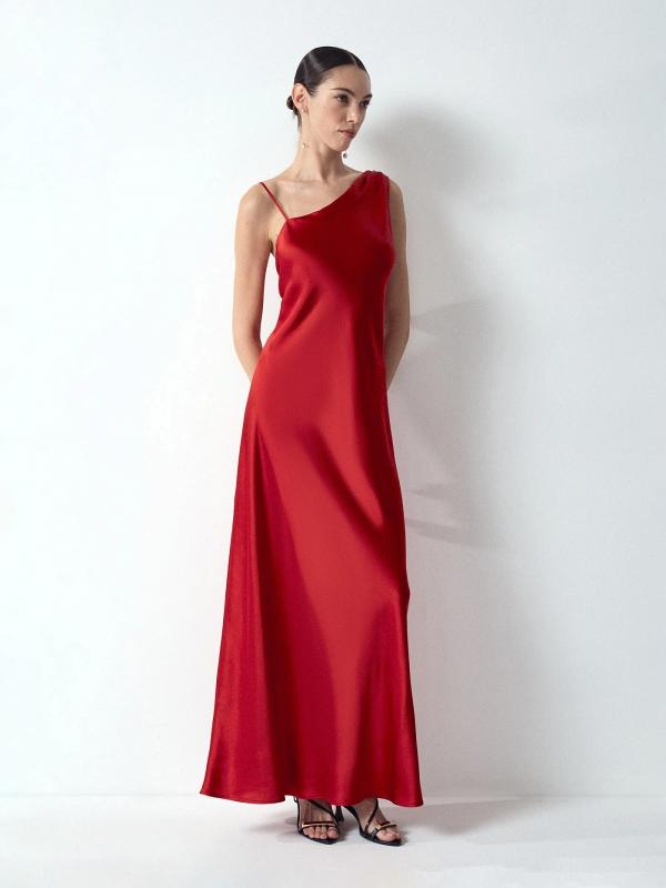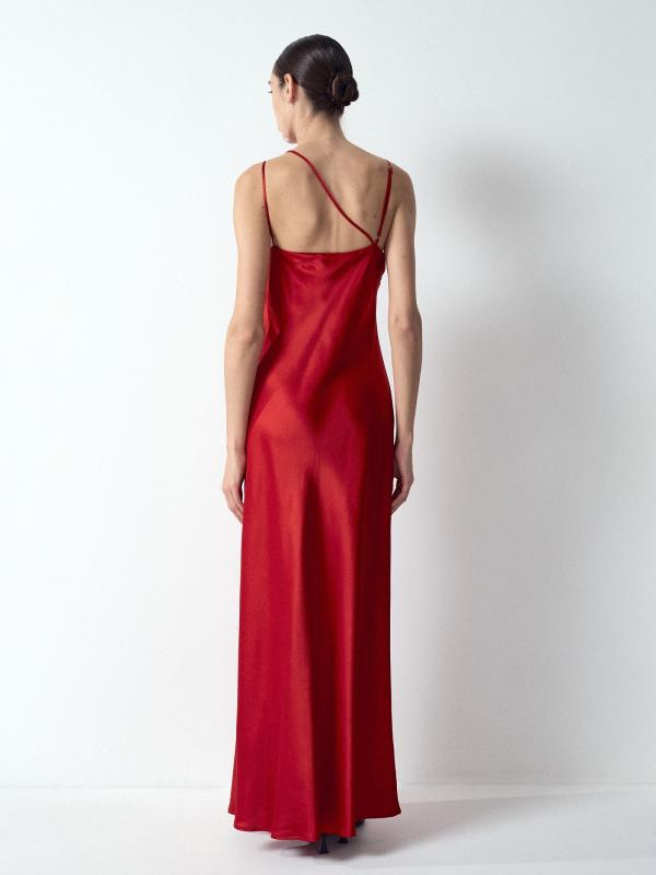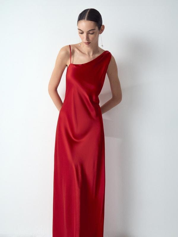 Асимметричное платье макси в рубиновом цвете создаст запоминающийся образ. Визуально вытягивает силуэт и стройнит. Подчёркивает красоту плеч и шеи. Выполнено из приятной к телу вискозы, без подкладки.